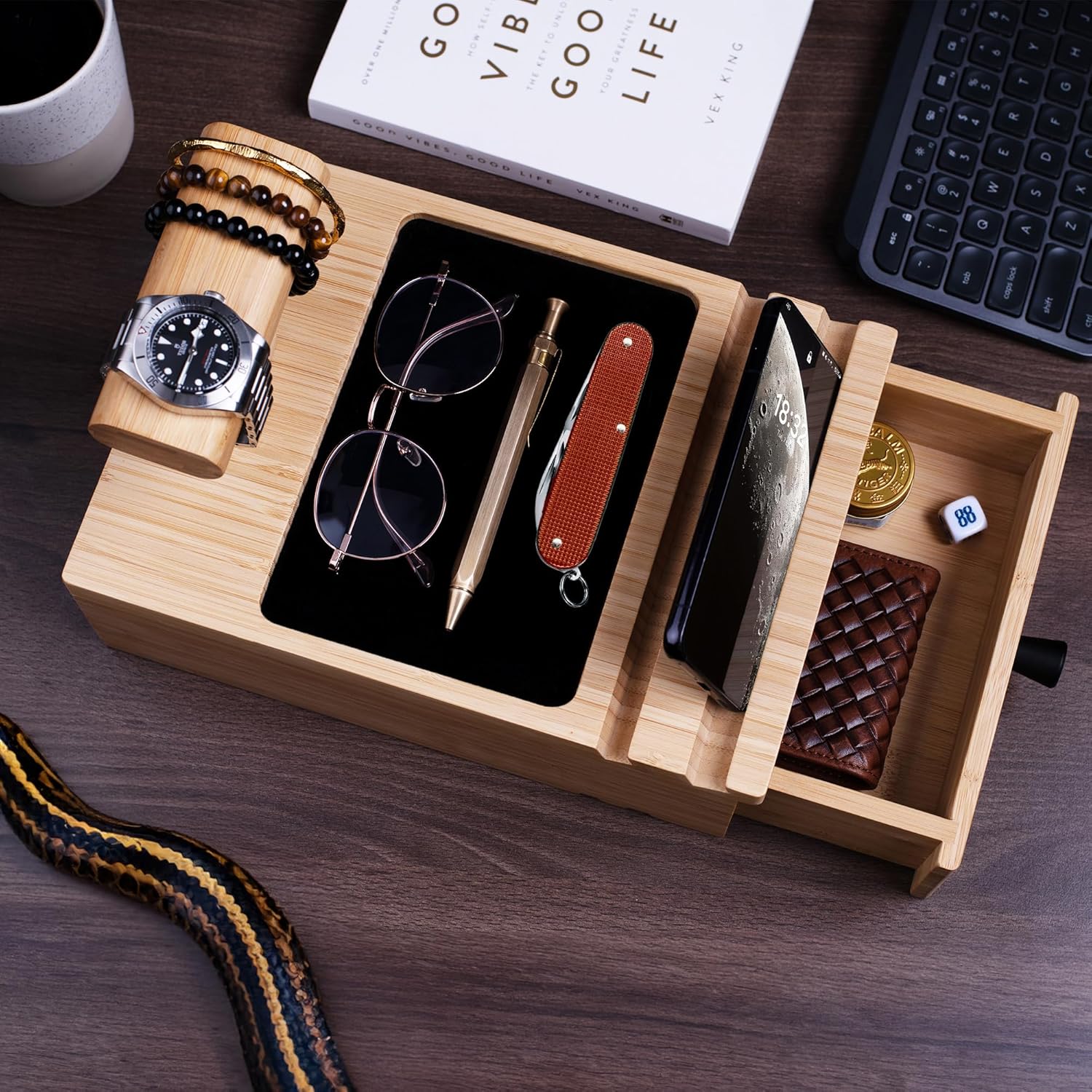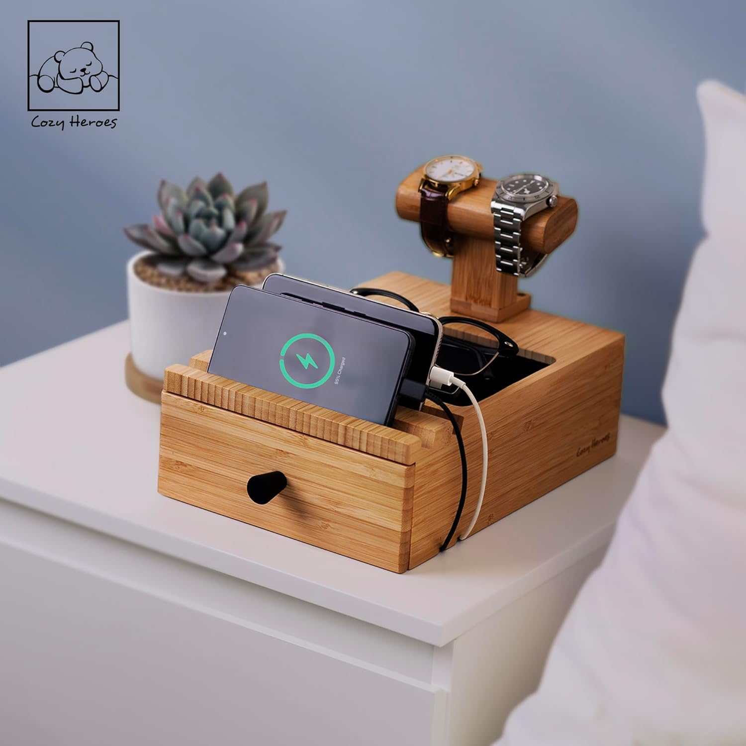Introducing our new wooden organizer for office and bedside use. Featuring dual watch hangers supporting Apple Watch charging, a spacious drawer for accessories, and a convenient valet tray for essentials, it ensures effortless organization. Enjoy its multi-device compatibility, catering to both Android and Apple phones and tablets, providing versatile storage solutions. Our wood phone docking station is crafted with durable construction and boasting patent-pending features, it's your stylish and functional organizational solution.