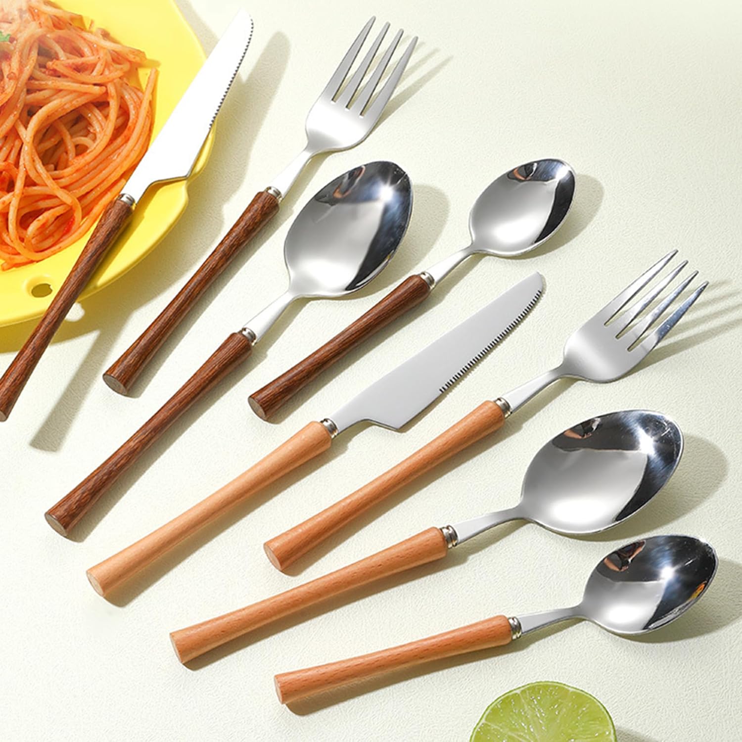 | Additional Features | cutlery set for home, flatware set, stainless steel set, wooden handle, wooden silverware set |