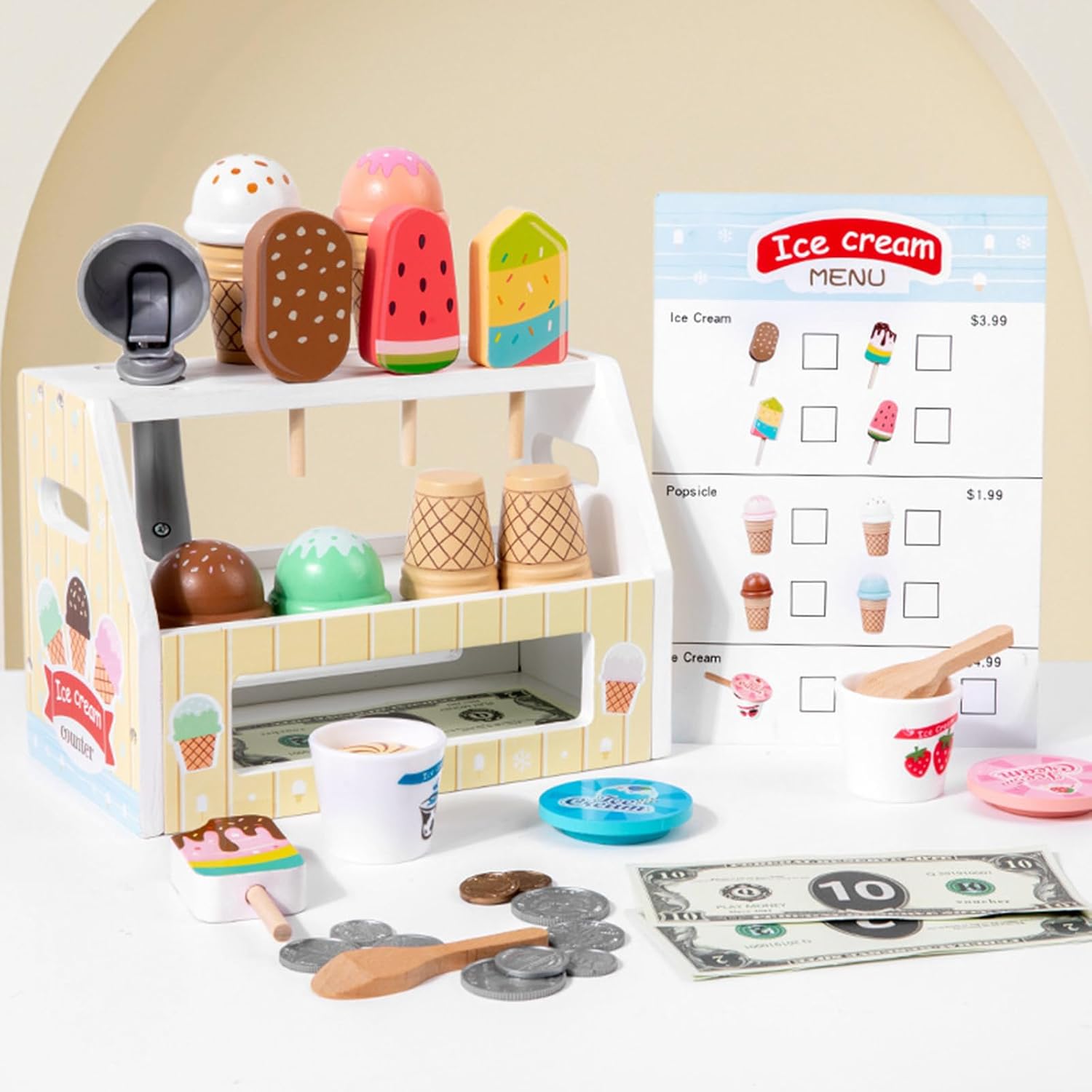 Wooden Ice Cream Shop Playset For Interactive Imaginative Play Activity Features: This wooden pretend play ice cream shop set enhances fine motor skills and creativity through realistic role play scenarios, featuring a complete accessories for immersive " order to serve " Crafted from safe wood with rounded edges, the playset includes 24 interactive pieces like ice cream cones, and cards for authentic shopkeeper simulations Ideal for preschoolers aged 3-6, this imaginative toy encourages social development in both and girls through collaborative pretend kitchen activities Perfect for interactive playdates or adventures, can explore entrepreneurship by operating the ice cream counter, handling transactions, and crafting colorful dessert Designed as engaging birthdays or holidays, this wooden playset fosters cognitive growth while meeting international toy standards Specifications: Component: Wood Size: Approx.21.2x11x14.6cm / 8.35x4.33x5.75inch Color: 4 Option Quantity: 1 Set Package Includes: 1 Set Ice Cream Model Toy Note: Please allow 1-2cm errors due to manual measurement Due to the differences between different monitors, the picture may not reflect the actual color of the item