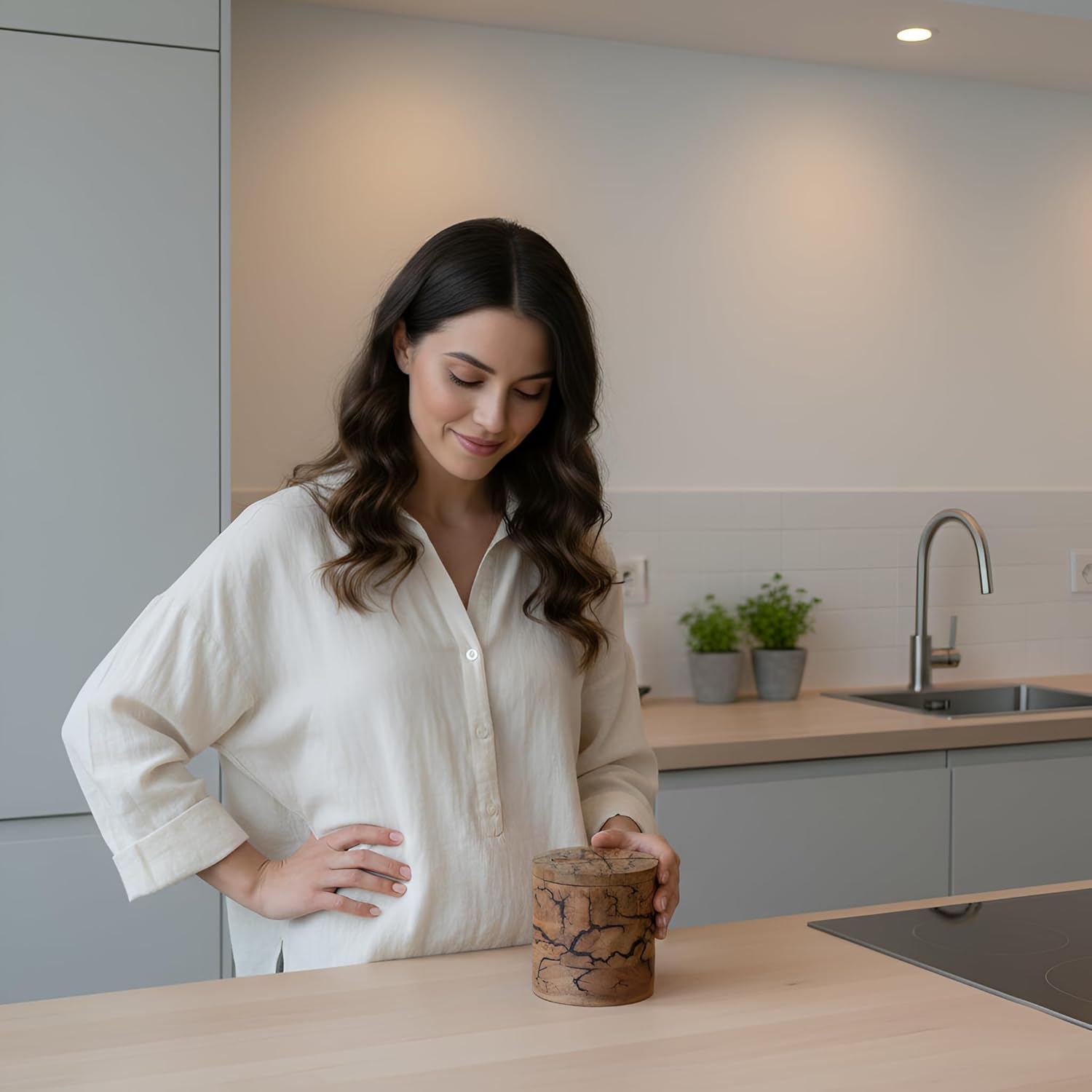 Elevate your kitchen organisation with this beautifully handcrafted mango wood storage jar. Boasting a generous 1-litre capacity and measuring 12.7 x 12.7 x 14 cm, this versatile container is perfect for storing tea, coffee, sugar, salt, dry fruits, spices, and other pantry essentials. The jar features an innovative magnetic closure system that keeps contents fresh and moisture-free, while the included wooden spoon fits conveniently inside. The exquisite fractal design adorning the exterior adds a touch of artisanal charm to your kitchen decor. The thoughtfully designed lid ensures easy access to contents, making it practical for daily use. Whether you're organising your kitchen essentials or seeking a stylish storage solution, this handcrafted wooden jar combines functionality with traditional craftsmanship.