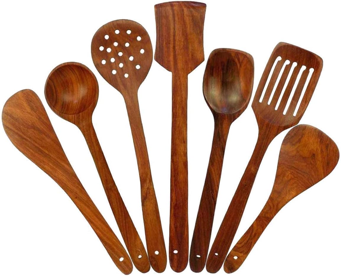 About this item WOODEN SPOON SET : These serving and cooking spoon kitchen set is a perfect cooking ware for your day to day kitchen and cooking needs with this wooden spatula set MULTI USE SET : This kitchen set of kitchen items cooking accessories include various type of spoons such as pasta server, serving spoon, soup ladle, flat spatula and wok turner EASY MAINTENANCE : Wash with mild soap or liquid, do not scrub a lot as it might scratch the wooden spoons, polish with oil every month