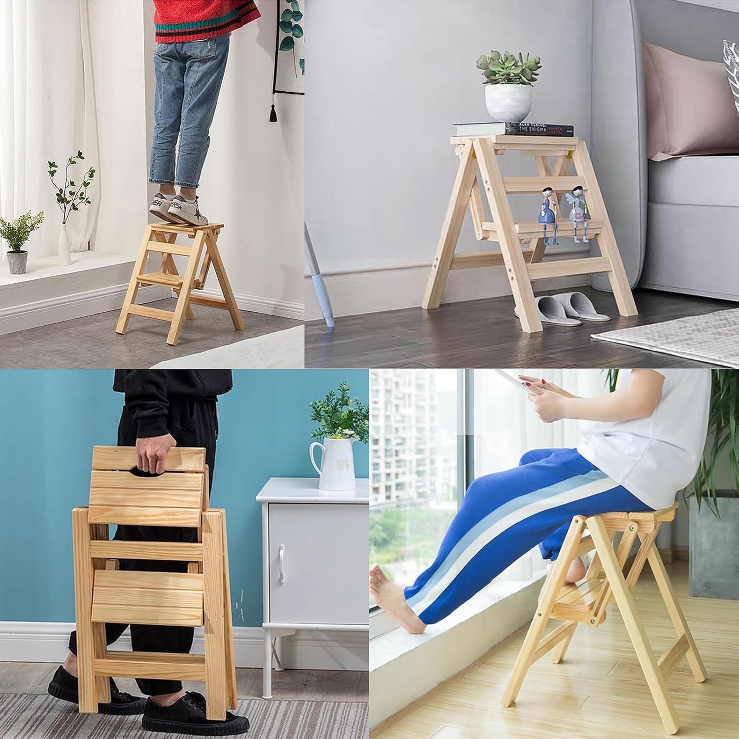 The surface of this folding chair has been delicately polished and has no burrs. You can safely use it for your children or family members. With the step stool, it can bring convenience to your life. For example: Helps you teach your kids to reach new heights at the sink or toilet; They'll love it when you teach them to brush their teeth, wash their hands, climb into bed, and more; For adults, this step stool can help You place items high up in your home, and it can also help you install ceiling light bulbs, etc. I believe it is the best gift for friends and family!Package includes:1 * Wood Folding Step Ladder Chair