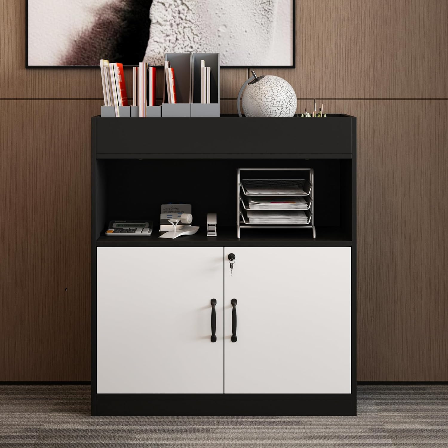 This WOODTIME file cabinet features 3 compartments that provide plenty of space for you to store your files, tools, books, tableware and household items. The top can hold frequently used items, decorations, and prevents them from falling. The door comes with a lock to better protect your belongings and privacy. The two-tone black and white aesthetic make this filing organization storage cabinet contemporary and stylish, adding timeless charm to your space. It can be paired with various styles of furniture to help you create a modern, minimalist interior. Cabinet dimensions: 15.7"D x 31.5"W x 35.4"H. PB & MDF. Modern. White & Black