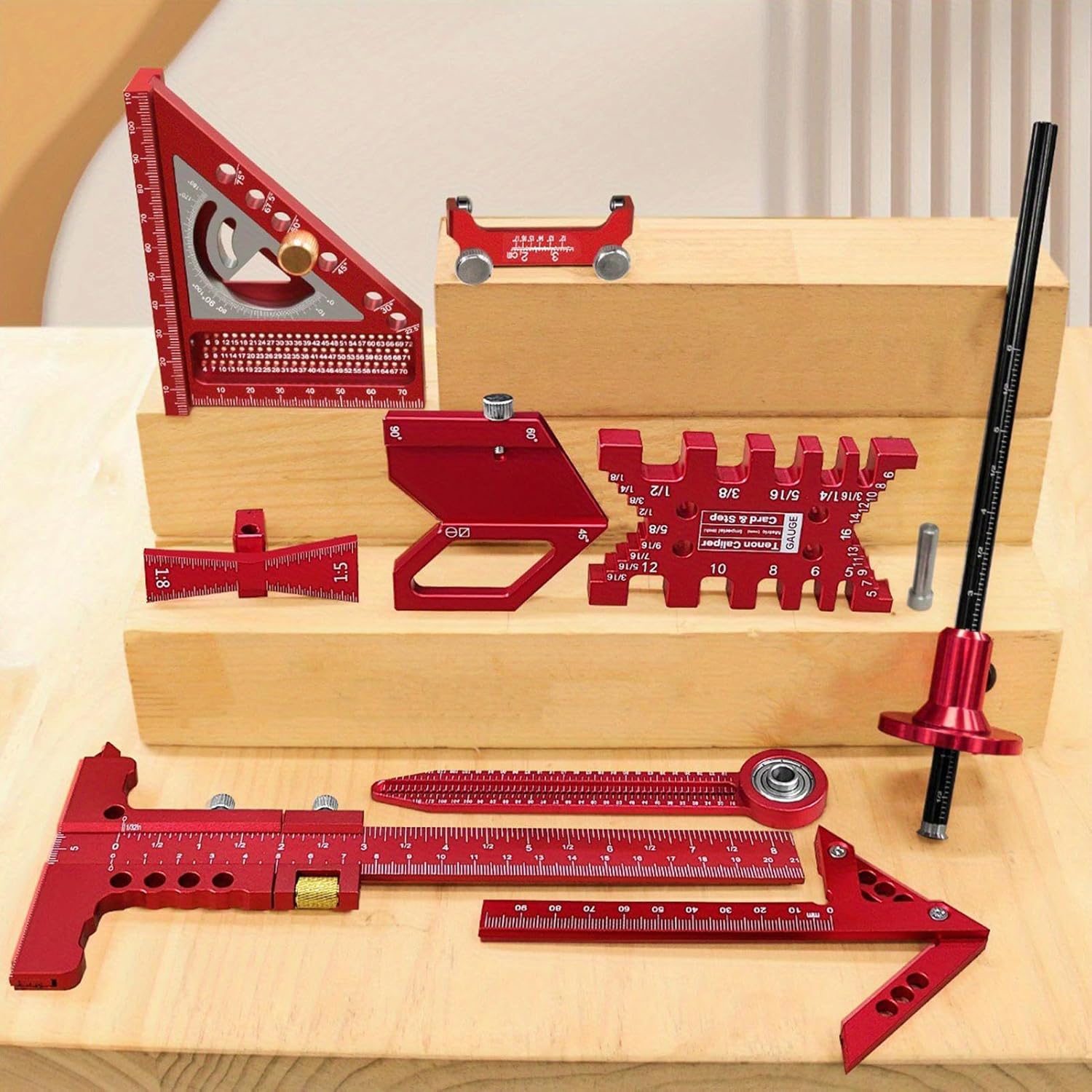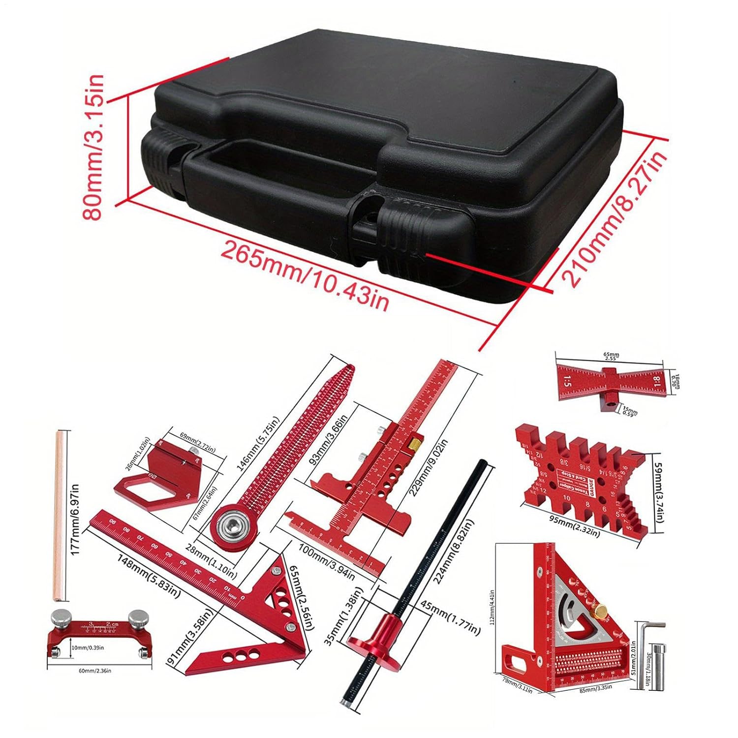 Woodworking Measuring Kit: 10 Pieces Aluminum Carpenter Tools, Speed Square Layout Rules, Dovetail Marking Indicator, Center Tracing Compass, Precision Woodworking Set for Home Garage Flooring The square roof beam kit is a key tool set designed for woodworking and woodworking projects, providing precision and versatility in every task. This complete kit includes a ruler and a gauge, allowing users to achieve accurate measurements and markings effortlessly. Ideal for home workshops, garages or outdoor environments, it supports a wide range of applications in industries, furniture manufacturing, and office-related projects. Specification Product Name: Square for Framing Material: aluminium alloy. Product size: Note according to the picture Weight: about 1200g 10-piece set: standard combination multi-angle square, fixed angle sharpener, dovetail gauge, gauge, 2-in-1 ruler, center tracer, tracer, drawing compass, European plotter (included pencil) Product List: 1 set* Frame Square Note: Due to different lighting and screen settings, the colour of the item may be slightly different from the picture. Due to different manual measurements, please allow 1-2cm size difference.