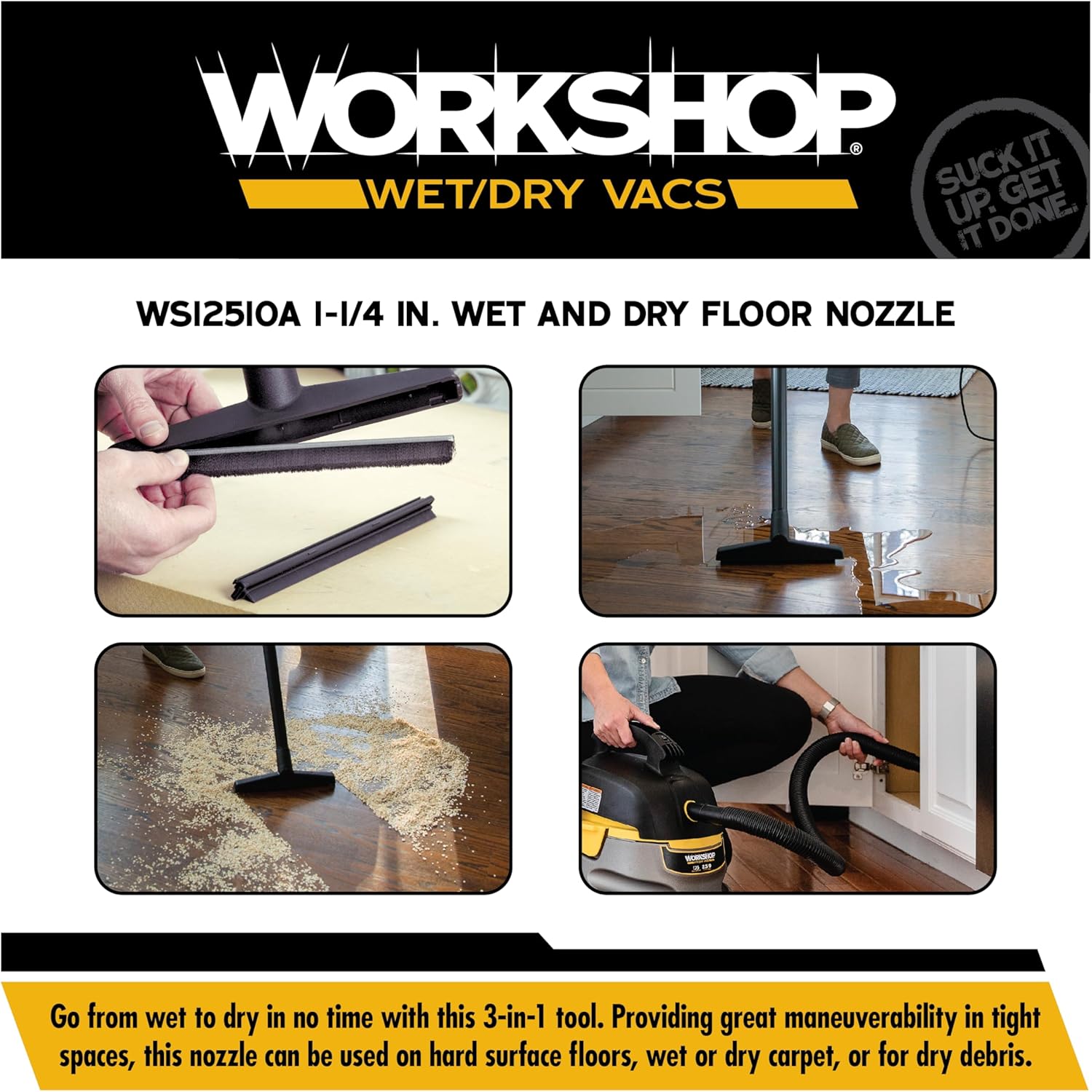 Product Description Elevate your cleaning efficiency with the WORKSHOP Wet Dry Vacs WS12510A versatile floor tool attachment. Perfectly crafted for tackling both wet and dry messes, this accessory features a squeegee insert for wet spills, a floor brush for dry debris and without inserts, the nozzle can be used as a carpet wand for wet carpets. Easily switch between tasks by removing the squeegee for dry vacuuming or inserting the brush to sweep debris into the airstream for quick collection. Designed for maneuverability in tight spaces with a 1-1/4-inch diameter, it fits most wet dry vacs equipped with 1-1/4-inch hoses and wands. Pair it with your WORKSHOP Wet Dry Vac model WS0255VA for a comprehensive cleaning experience. Enhance your wet/dry vac vacuum's efficiency by choosing the right tools and attachments for each task. Suck It Up. Get It Done. with this essential wet and dry floor tool accessory and streamline your cleaning efforts. From the Manufacturer The squeegee used for wet pick-up can be removed for use as a dry nozzle. The 1-1/4" diameter is designed for maneuverability in tight spaces.
