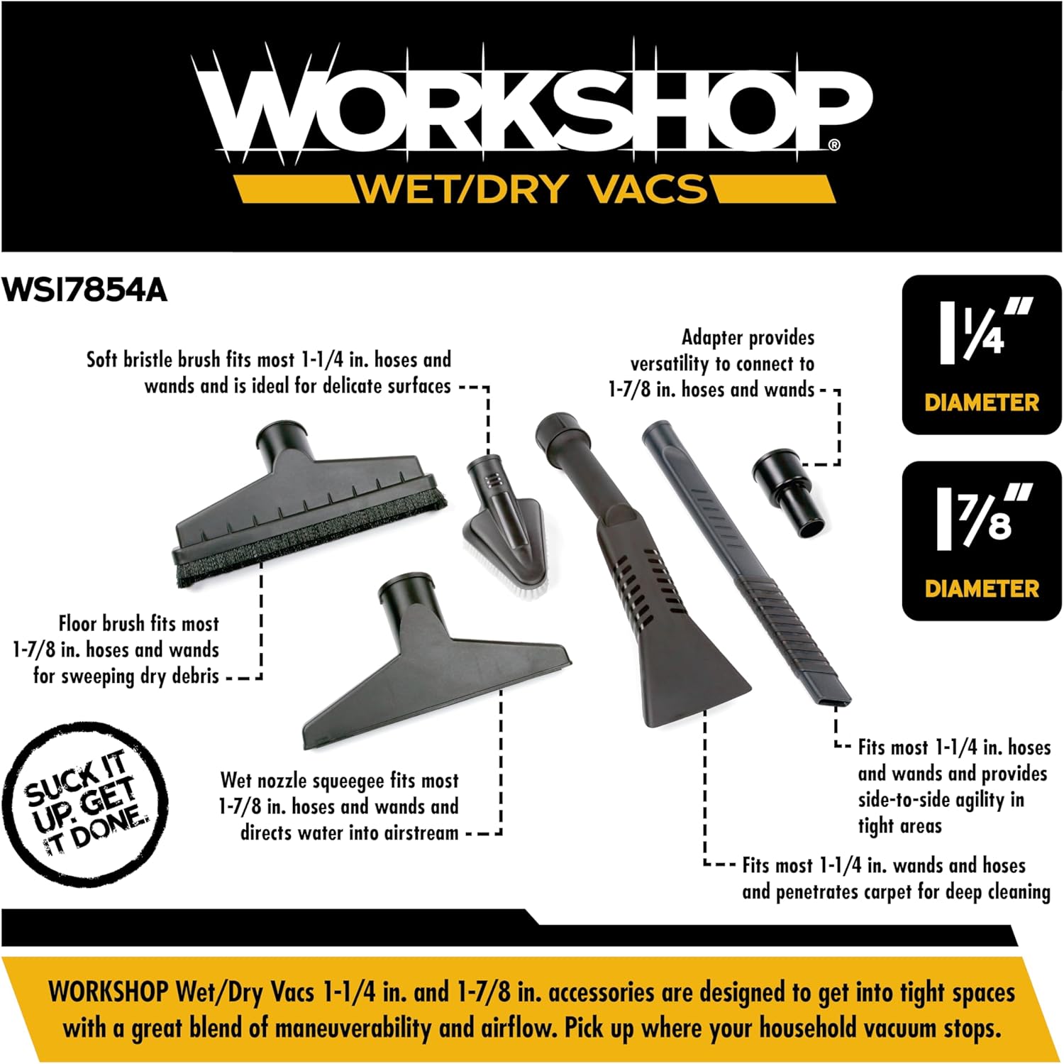 Unleash the full potential of your cleaning routine with the WORKSHOP Wet/Dry Vacs WS17854A Homeowner DIY Attachment Kit. This comprehensive 6-piece set includes essential tools to tackle any mess: a wet nozzle for efficient water collection, a floor brush with reversible bristles to sweep and vacuum dry debris, a claw nozzle for penetrating deep into carpets, a flexible crevice tool side-to-side agility in tight spaces, and a triangular soft bristle brush for delicate dusting of softer materials. The included adapter seamlessly connects most 1-7/8-inch hoses and wands to 1-1/4-inch accessories, ensuring compatibility with most wet dry vacs, including models WS0301VA, WS0400DE, WS0501WM, and WS0915VA. Choose the right tool for every task to boost efficiency and performance. Suck It Up. Get It Done. with this essential homeowner DIY accessory kit and streamline your cleaning efforts.