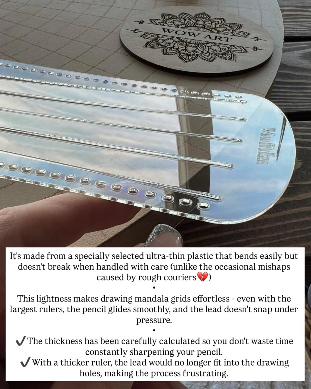 WOW-Ruler 3-in-1 The Ultimate Mandala Layout Tool The WOW-Ruler is a smart 3-in-1 tool that replaces your ruler, compass and protractor. It helps create clean and accurate grid layouts for mandalas, dot art, geometric patterns and symmetrical designs quickly and easily. Its design combines a straight edge for radial lines, a compass-style arc system for smooth circles and protractor-like markings for evenly spaced angles. This tool speeds up layout work and makes symmetry simple for beginners and experienced mandala artists. It is a reusable stencil that helps build clear and consistent mandala foundations. Available Sizes Small 15 cm 6" for mandalas up to 30 cm 12", ideal for small canvases, cards and wood dot-art. Medium 30 cm 12" for mandalas up to 60 cm 24", a versatile size for canvas and wall art. Large 50 cm 20" for mandalas up to 100 cm 40", perfect for large decor pieces and statement artworks. Each ruler includes a center pin hole, straight guides, angle markings and arc slots for building a precise symmetrical grid. How It Works Attach the ruler to the center of your canvas with the included pin. Use angle notches to divide the circle evenly. Choose an arc hole for the radius and draw a clean circle. Use straight guides to draw aligned radial lines. Material and Care Made from 1 mm clear flexible plastic that is thin, durable and fully transparent for precise visibility. Avoid dropping or bending with force. Clean with warm water and mild soap. Do not use alcohol, acetone or harsh solvents as they cause cloudiness. With proper care the ruler remains clear and accurate for years. Please Note A slight smell from laser cutting is normal and fades quickly. Not intended as a toy. Colors may vary slightly depending on monitor settings.