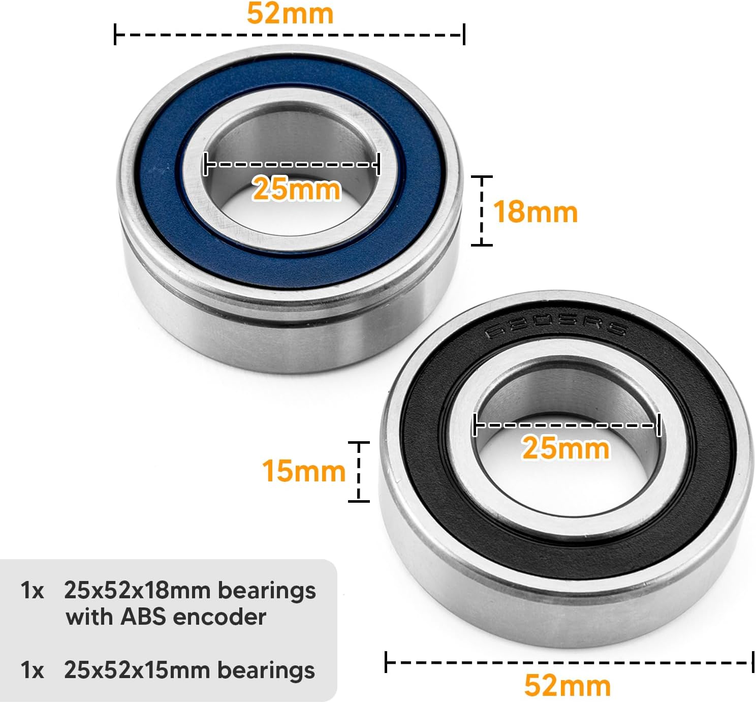 Fitment List Please check the below fitment list before purchasing. Front wheel Applications: Compatible with FLHT, FLHX, FLHR, FLTR 2008-2024 (w/ ABS) Compatible with FXS/FLS/FLST/FXCW 2011-2017 models (w/ ABS) Compatible with FXD/FXDWG/FLD 2012-2017 models (w/ ABS) Compatible with Softail 2018-2024 Compatible with V-Rod 2008-2017 (w/ ABS) Compatible with XL 2015-2022 models (w/ABS) Rear wheel Application: Compatible with FXS/FLS/FLST/FXCW 2011-2017 models Compatible with FXD/FXDWG/FLD 2012-2014 models (w/ ABS) Compatible with Softail 2018-2024 Compatible with V-Rod 2008-2017 (w/ ABS) 【Package Includes】 1x 25x52x15mm bearing (Part Number No. 9276A/9276B) 1x 25x52x18mmbearing (Part Number No. 9252/9252A) with ABS encoder. 1 x Wheel Bearing Puller (1.00" ID) 1 x Wheel Bearing Puller (0.750" ID) 1 x Main Body Puller 1 x Bearing Installer (1.00" ID) 1 x Bearing Installer (0.750" ID) 1 x Installer Backing Plate 1 x Expander Dowel 1 x Bearing 1 x 1/2"-13 x 12" Bolt 1 x Brass Washer 1 x 1/2" SAE Flat Washer 1 x 1/2"-13 Nut 1 x 3/4"-16 Nut 1 x 7/16-14 Nut 1 x 7/16" SAE Washer 1 x 25mm Remover 1 x 25mm Installer 30 x Temperature Strips 1 x Instructions Sheet