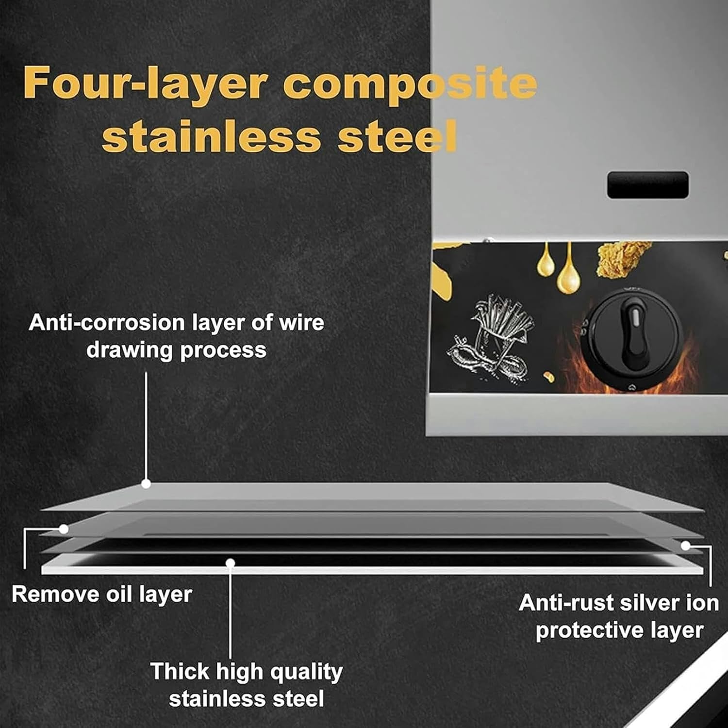 The description:Product Name: Double Pot Double Gas Stove with Stand and Two Frying BasketsHeating method: liquefied gas heatingMachine size: 55cm*35cm*28cmLining size: 30cm*24cm*15cm (single)Tank capacity: 22L. (11L*2)Fried basket size: 18*20cm*2Dust cover * 2