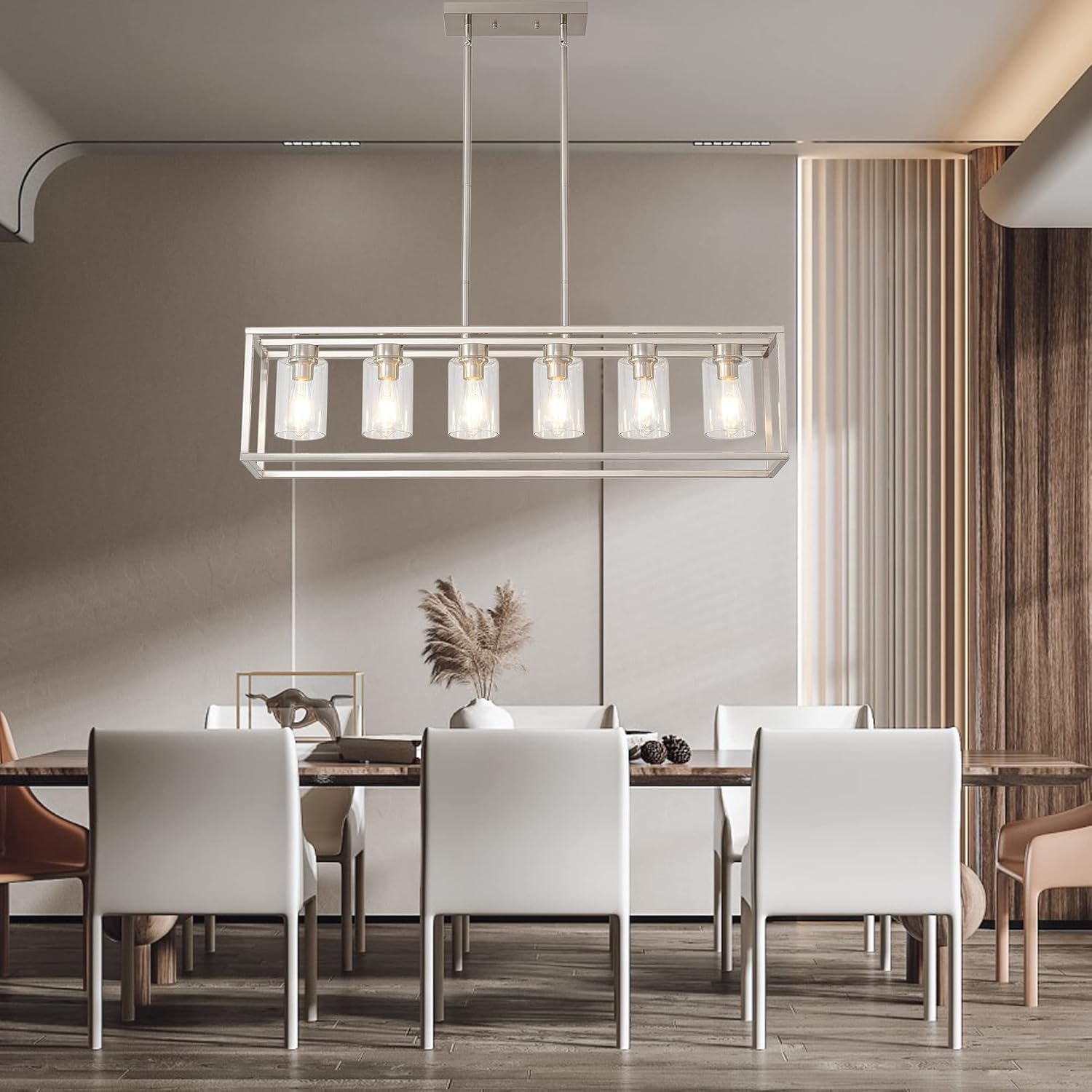 XILICON Contemporary Chandeliers Modern Dining Room Lighting Fixture Hanging Brushed Nickel 5 Light Kitchen Island Cage Pendant Lighting Farmhouse Flush Mount Ceiling Light with Glass Shade
