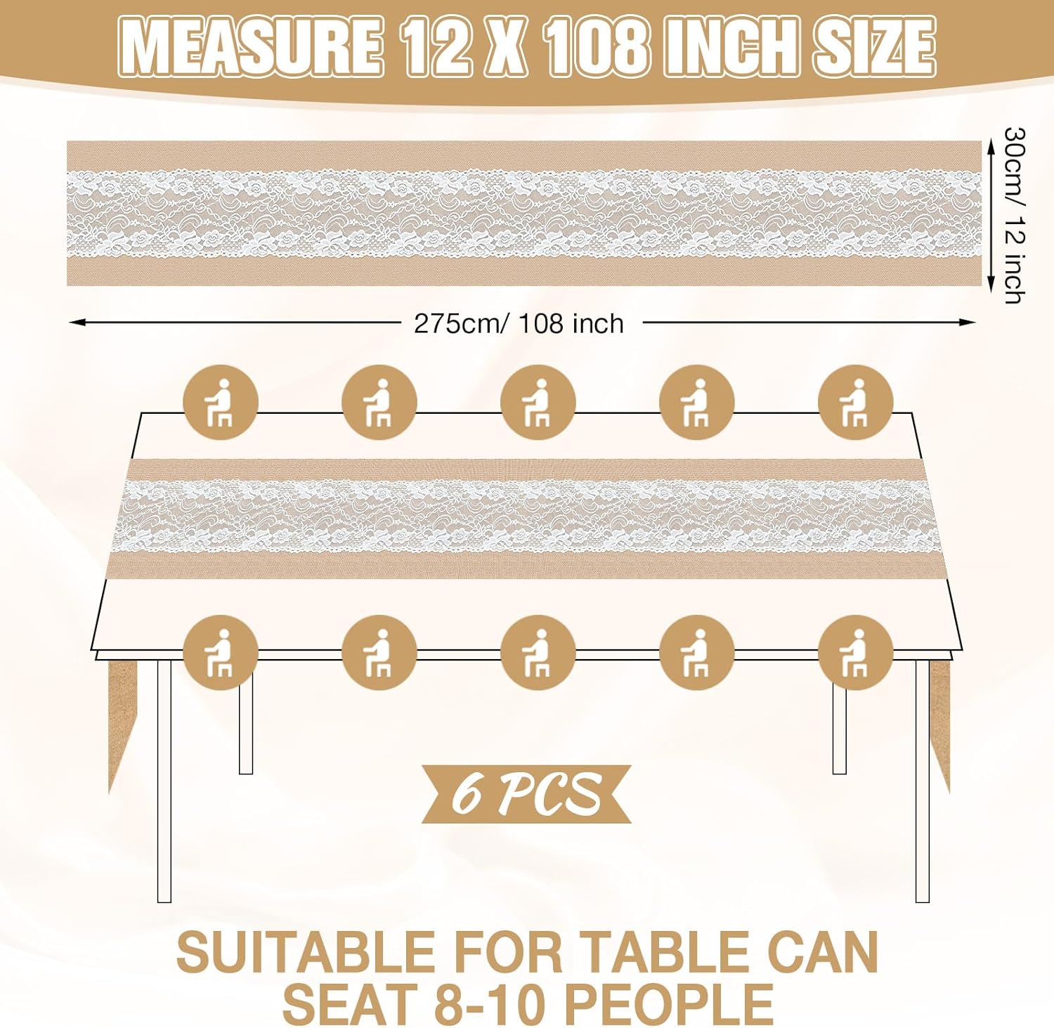 Features: This table runner with lights is nice for weddings, bridal showers, birthdays, engagements, family gatherings, Christmas, Thanksgiving and more. It creates a trendy and cozy feeling that will make any event more beautiful. Specifications: Material: jute burlap, lace Color: natural burlap tone Size: Burlap runner: about 12 x 108 inches/30 x 275 cm LED string lights: about 157.48 inches/4 meters in length Package includes: 6 x Wedding burlap runners 6 x LED string lights (40 lights) Notes: Manual measurement, please allow slight errors on size. The color may exist a slight difference due to different screen displays Warm reminder:For safety and longer life, always fully unfold the bulbs before use. Bundling them can cause overheating and hazards