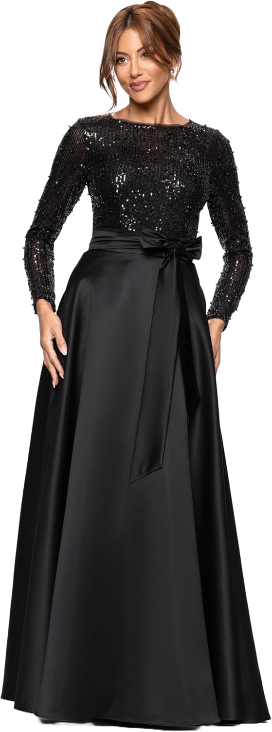 This gown features a sequin-embellished bodice with long sleeves, a scoop neckline, and a satin A-line skirt. A wide sash ties at the waist for definition, balancing sparkle with sleek volume.