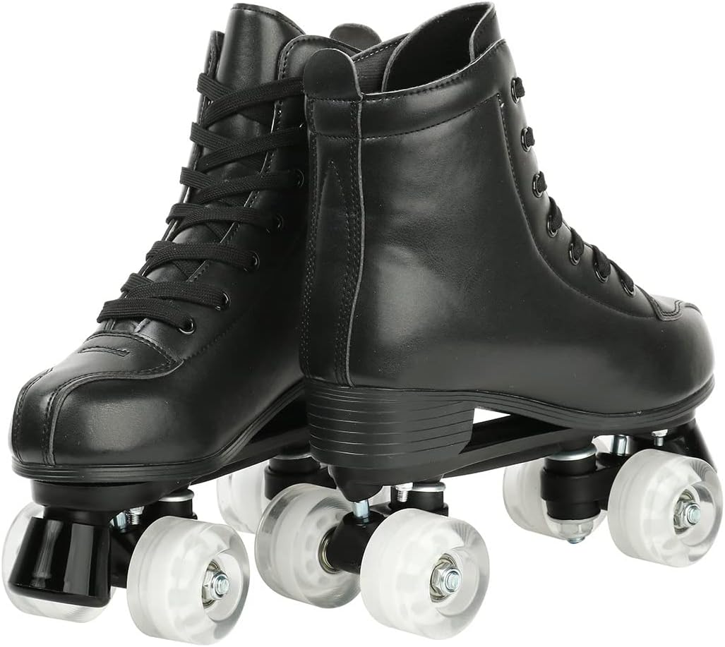 XUDREZ Roller Skates, Double-Row Roller Skates for Unisex, Roller Skates PU Leather High-top Roller Skates Shiny Roller SkatesThe principle of the flash four wheels is to make the wheels produce friction and power when turning the wheels on the ground, so that the wheels can produce shiny light (no battery and power supply required), which can sparkle in the dark. The shiny wheels make you more cool in the skating!Use these roller skates at the roller rink, or outside on paved trails, sidewalks, and boardwalks.If you are a beginner, skating lessons at the rink or park are a popular way to learn.Skating is a popular way to exercise while having fun!Find a local rink and get rolling!