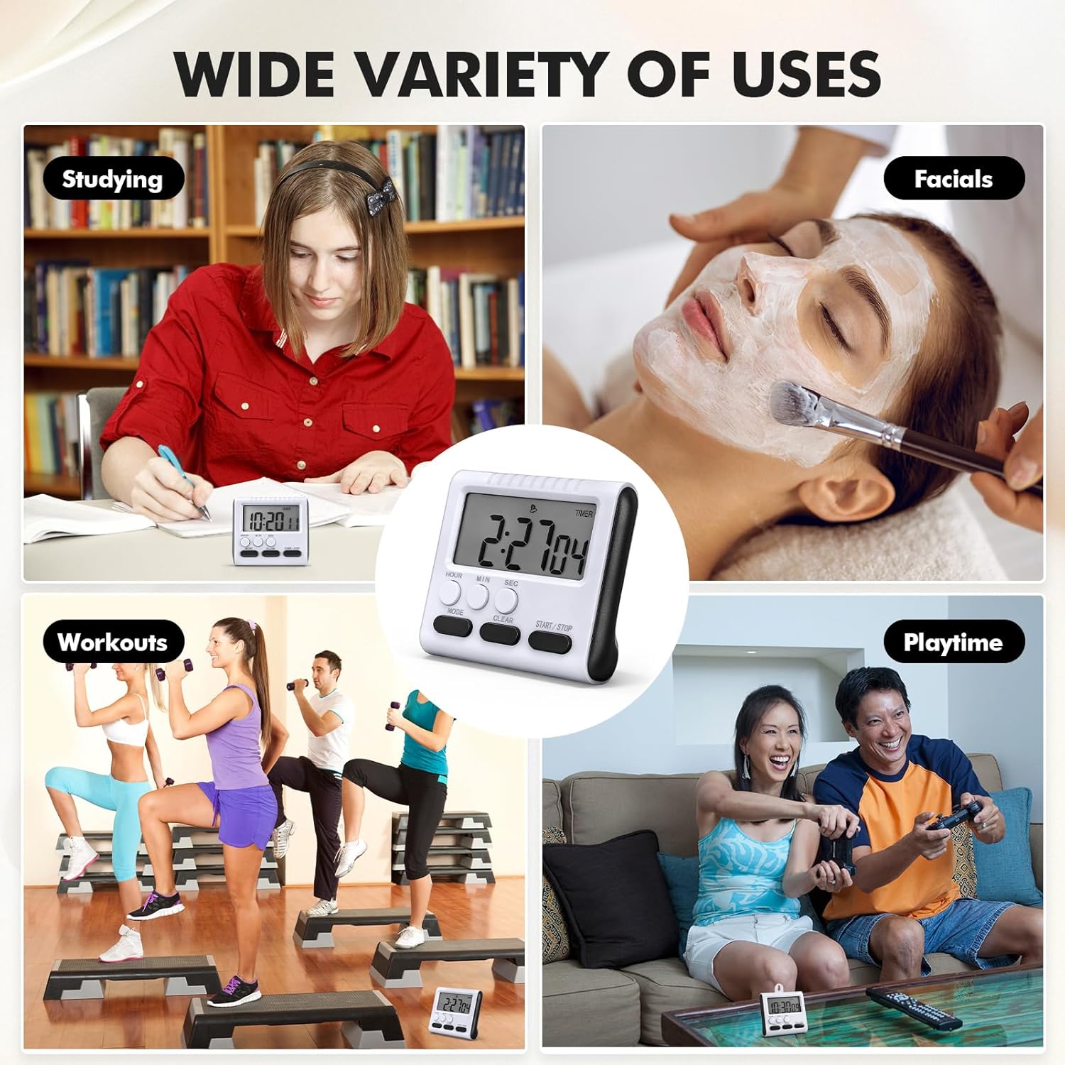 Features: Flexible placement options: Innovatively designed with magnets, hooks, and back brackets, this clock with timer allows flexible placement. Whether on the fridge, oven hood, or countertop. This convenient feature makes it one of the most adaptable kitchen timers for cooking, keeping it within reach as you create culinary masterpieces User friendly operation: Equipped with an intuitive timer instruction manual, the digital timer provides seamless operation. Its advanced memory function retains your last setting, offering reliable functionality as both a kitchen timer and digital countdown clock. Moreover, it ensures the numbers remain stable after 10 seconds in clock mode to prevent accidental time changes. Specifications: Material: ABS Color: white, black Size: about 3 x 2.7 x 0.9 inches / 7.65 x 6.85 x 2.4 cm Package includes: 15 x Kitchen timers Notes: Manual measurement, please allow slight errors on size. The color may exist a slight difference due to different screen displays