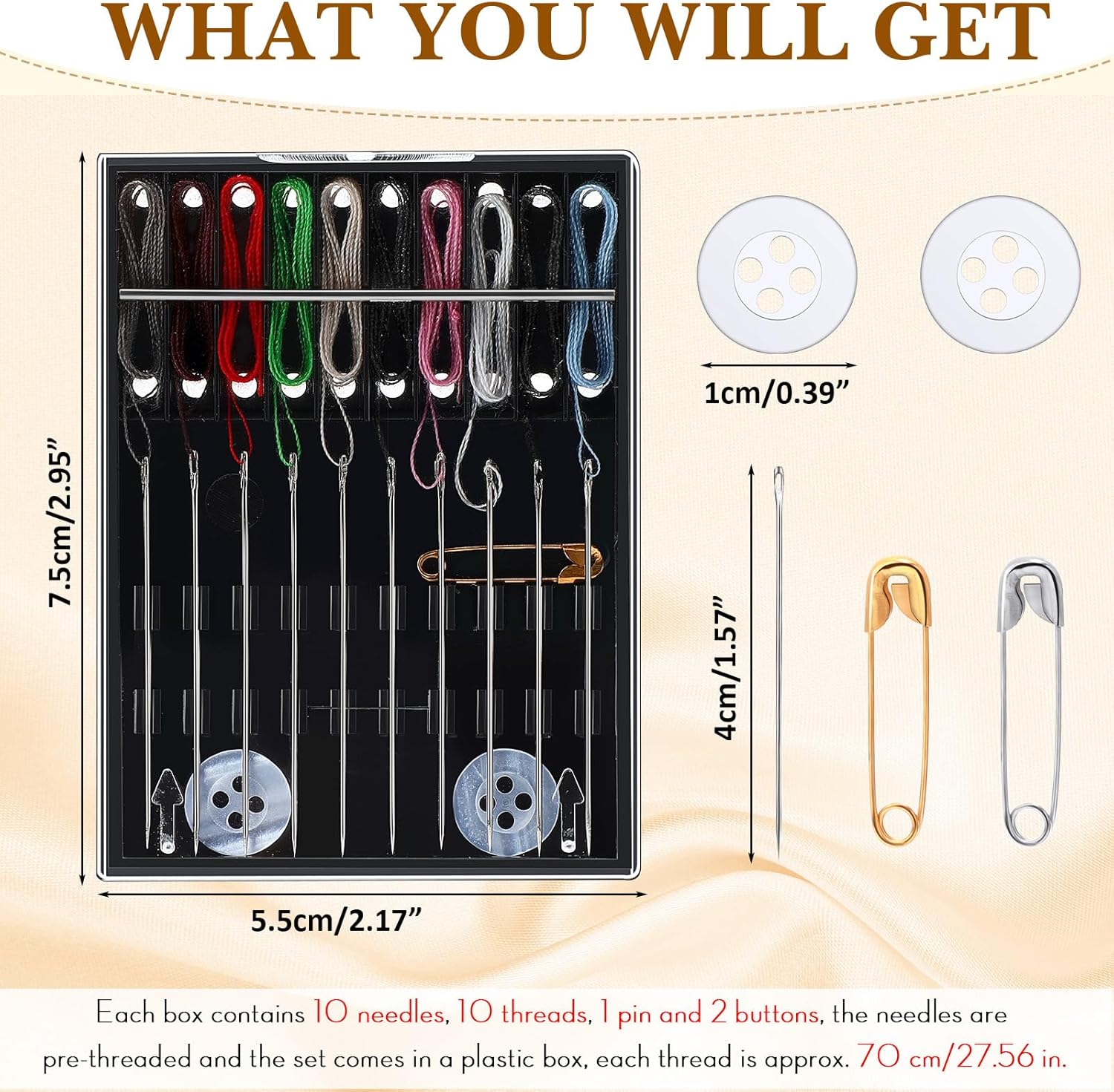 • Rational Combination: you will receive 72 boxes sewing kit bulk, each box includes 10 pieces needles and 10 pieces threads, 1 pin and 2 buttons, the needle is pre threaded, coming as a set in a plastic box
