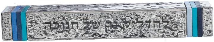 This Foldable Travel Menorah, designed and produced by the Jerusalem artist Yair Emanuel. Emanuel's designs are based on the combination of the classic traditional motifs, and the modern and Oriental. This Menorah had "old new" design The base of the Menorah is made of nickel-plated aluminum with hammer work and nine candle holes. The sides of the menorah are adorned by shades of blue rings. The Menorah can be lit both with candles and with oil. The Menorah can be cleaned by pouring boiling water to clean the wax. Folds easily and elegantly into a streamlined protective casing perfect for travel or storage