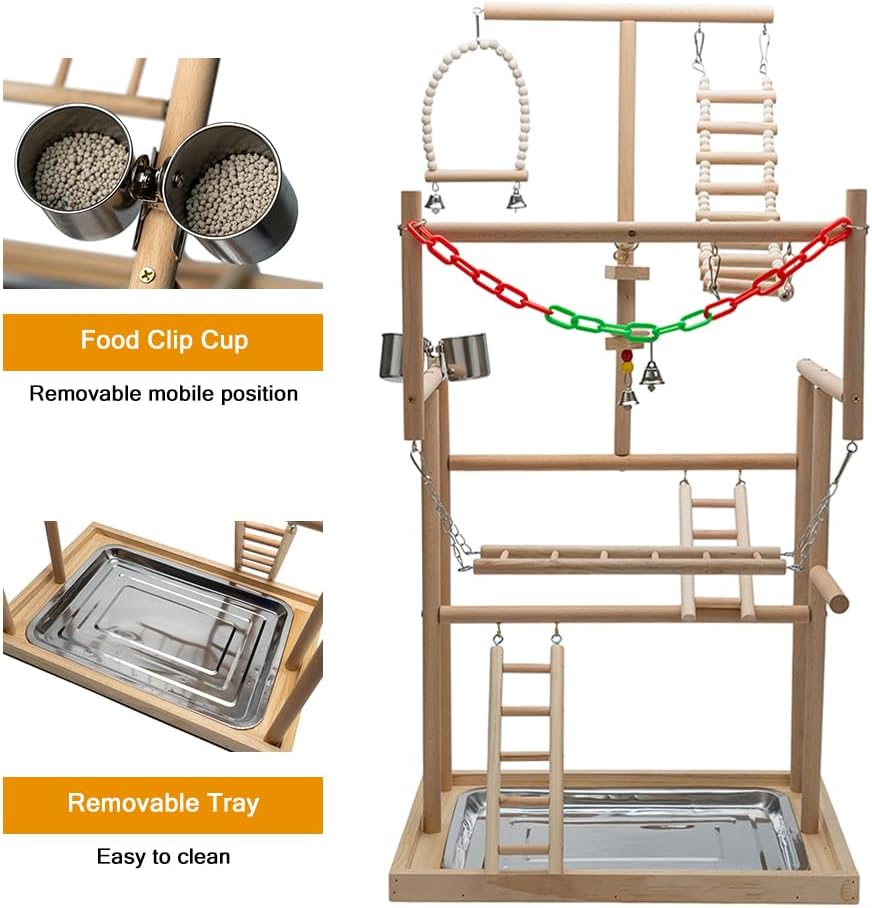 Yeeoy 4 Layers Pet Parrot Playstand Large Bird Playground Wood Bird Perch Gym Playpen Bird Play Stand with Feeder Cups Ladder Swing Bell for Cockatiel Lovebirds Exercise Activity Center . Features: The bird playground is completely handmade, all parts are connected with screws, easy to assemble and disassemble. Please note, you need to assemble this parrot playground yourself. You will receive the various parts of the product, please check if all parts are complete. The bird playground provides a colorful, fun environment for your bird to reduce boredom and stress. It includes multiple perches, ladders, swing and a pair of stainless steel feeding bowls for your pet to eliminate boredom and have fun with this bird playground. This bird playground simulates the natural environment and provides stimulation for your bird mentally and physically.Brightly colored toys appeal to the bird's strong eyesight capabilities. When kept as pets parrots need time outside of their cage to play, to exercise and to interact with their human companions. Keep your parrots in a stable and happy mood and improve their health. Our bird playground offers great fun to your bird. It is a comfortable place for your pets and offers additional exercise opportunities for them to play, exercise, eliminat boredom, get good climbing training and improve the level of exercise.