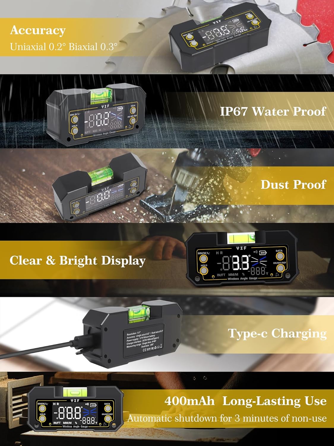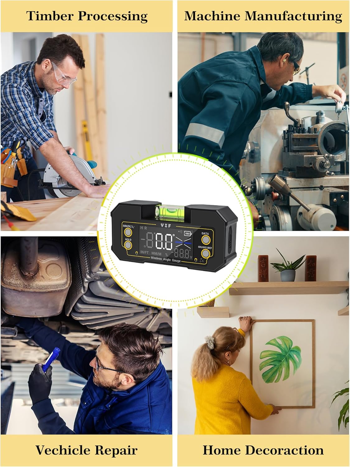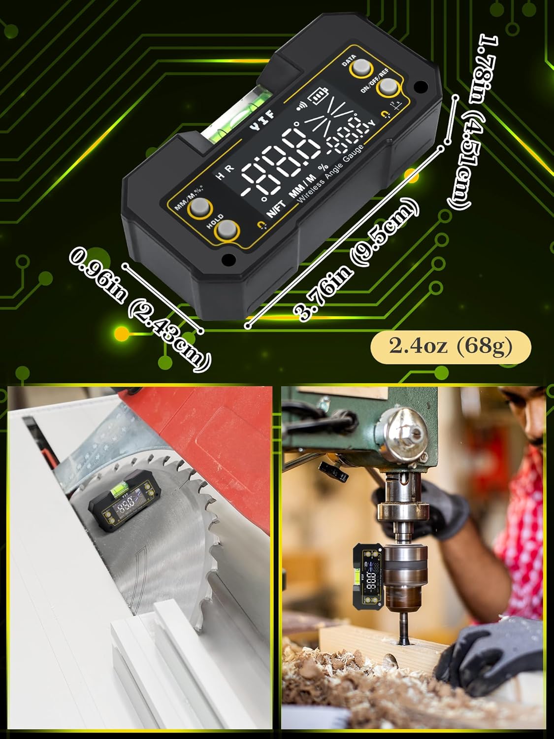 Wireless Digital Angel Finder from YIF - the ultimate angle measuring tool for all your woodworking needs! This advanced digital level with slope percentage gives you precise and accurate measurements so you can achieve flawless cuts every time. The Digital Angle Finder is a versatile and powerful angle finder tool that lets you measure angles with ease. From cutting crown molding to creating perfect miter joints, this digital angle finder magnetic helps you achieve the perfect angle with minimum effort. With its magnetic base and compact size, the Magnetic Angle Finder is designed to attach easily to your table saw, making it the go-to choice for professional woodworkers. Its digital display and easy-to-read measurements provide quick and reliable results. The Angle Finder Tool Digital provides both convenience and accuracy, allowing you to easily measure angles between 0 to 220 degrees. The Digital Protractor also has a hold function that locks the measurement for easy reading. The Magnetic Level adds to the tool's versatility, allowing you to measure horizontal and vertical angles with ease. This Digital Angle Gauge is ideal for a wide range of applications, including woodworking, metalworking, construction, and engineering. In conclusion, the Wireless Digital Angel Finder from YIF is a must-have tool for anyone who is serious about their workmanship. Its reliability, accuracy, and versatility make it the perfect tool for magnetic to table saw customers. Get yours today and take your woodworking to the next level!