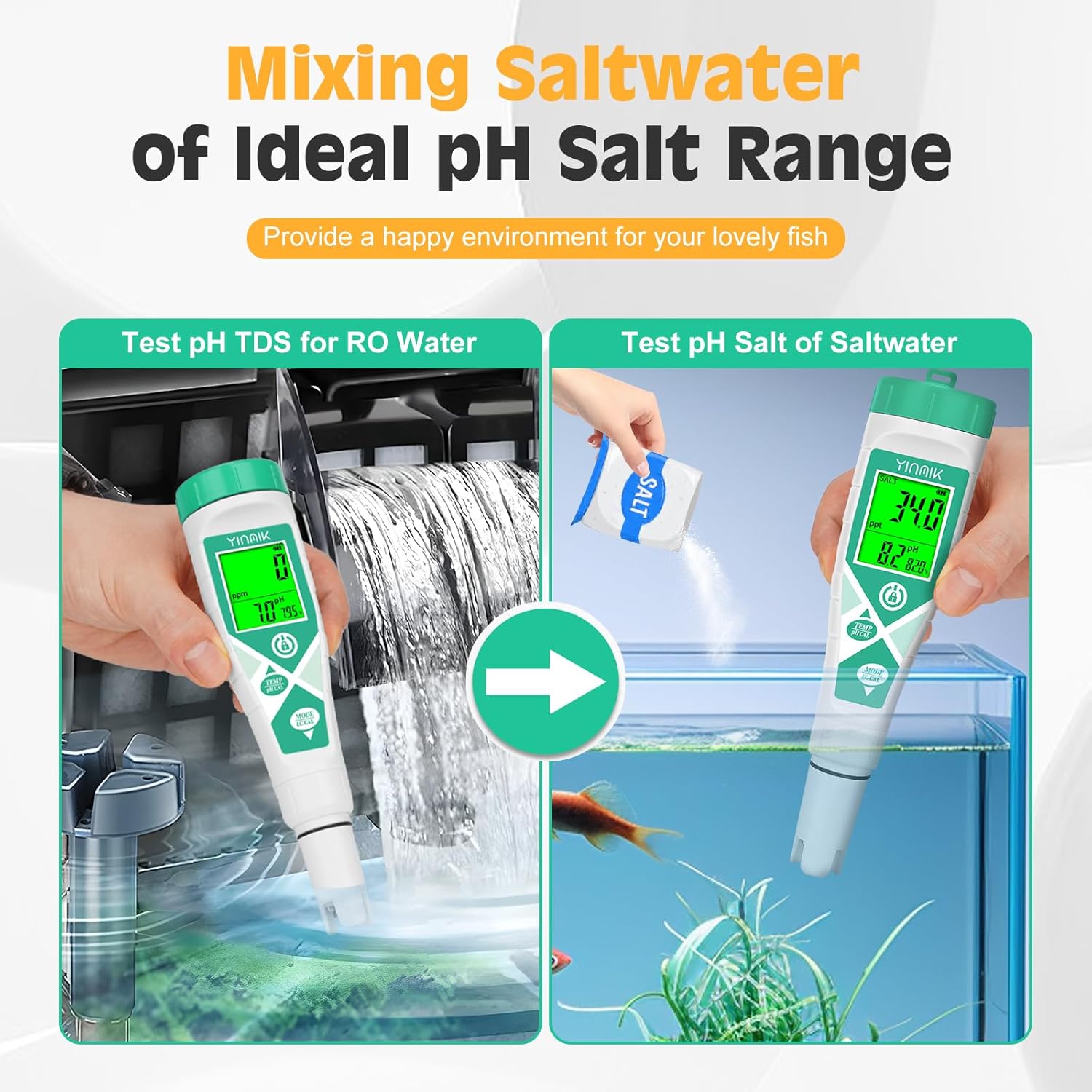 • 2025 Professional Aquarium pH Salt Tester: YINMIK pH salinity meter is designed with ultra-wide test range (pH 0-14, Salinity 0-100ppt), which can meet the pH and salinity testing needs of various saltwater fish, saltwater fish, freshwater fish and koi, and this aquarium salt meter is very suitable for home aquarium enthusiasts. Also, with this salinity pH meter, you can provide a happy pH & salinity water for your saltwater aquarium pets. Ideal aquarium test accessory for aquariums beginners.