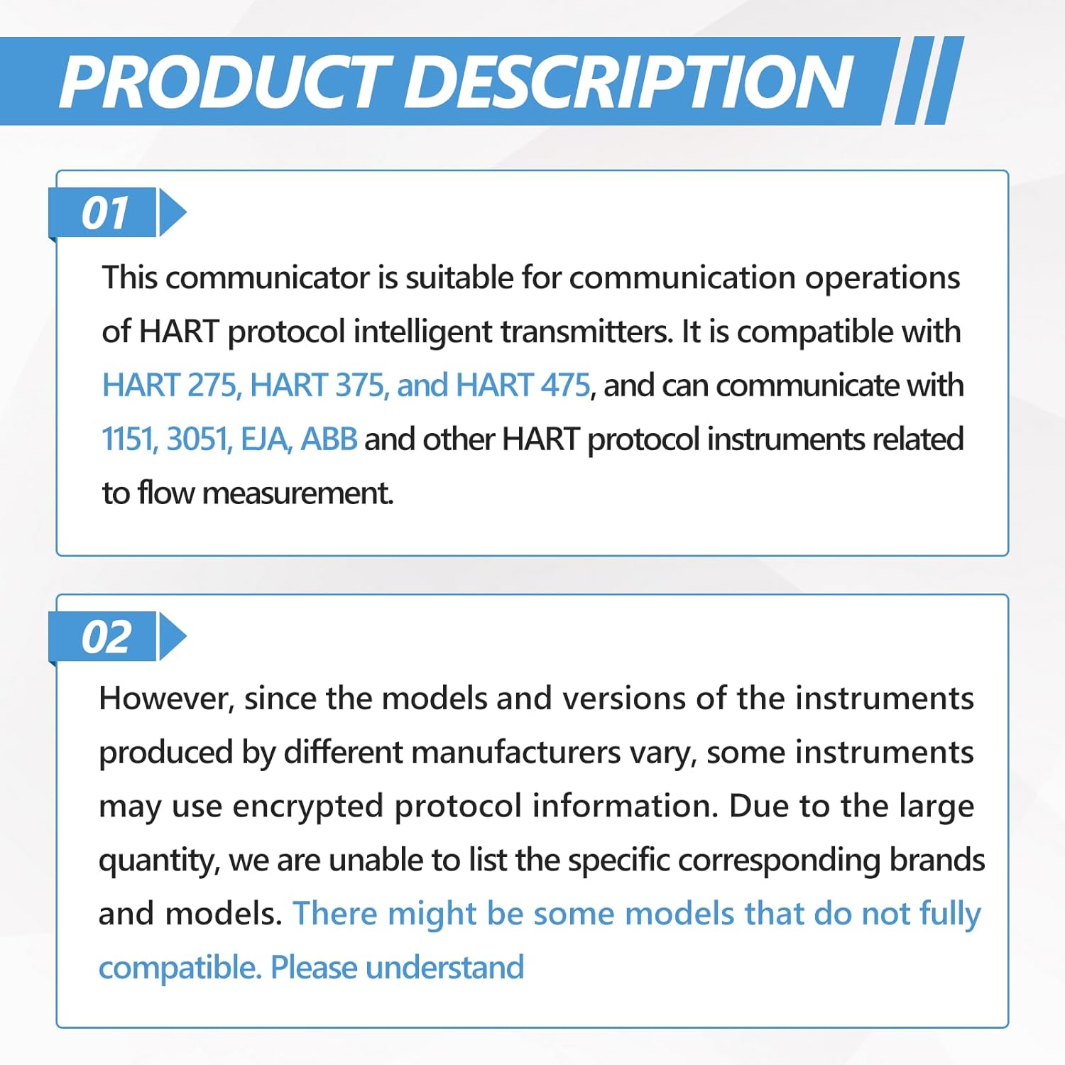 Handheld Field Communicator: Model: Hart 475 Accuracy class: 0.05% F.S Digital communication: Hart protocol Battery storage: -20~50°C Operating temperature:-10~ 50°C Relative humidity: 0~95% RH (no condensation)