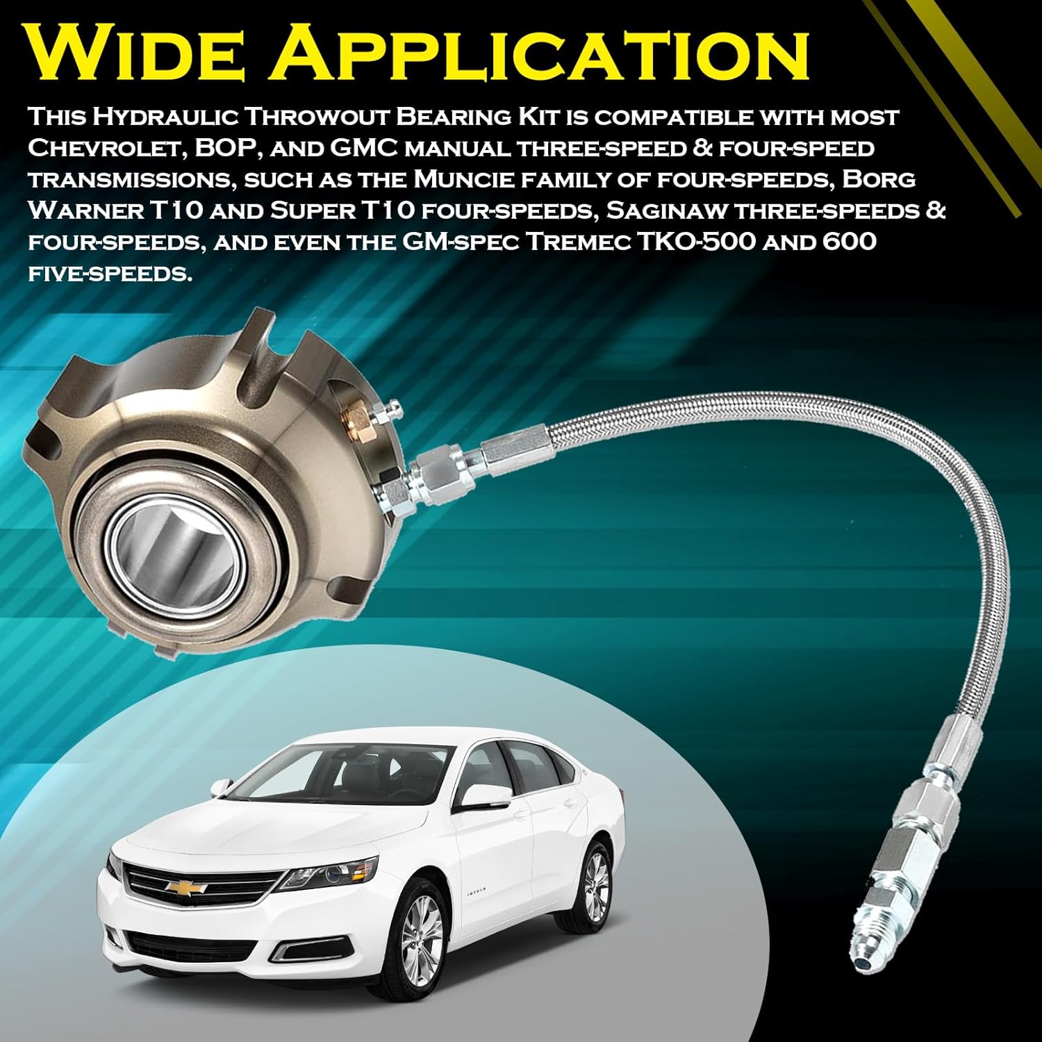 >>>PACKAGE INCLUDED: This hydraulic throwout bearing kit provides 1* hydraulic release bearing, 1* AN teflon lined hose, 8* 5/16-inch and 3/8-inch anti-rotation studs, 24* adjusting lock nuts, 5* adapter fittings.