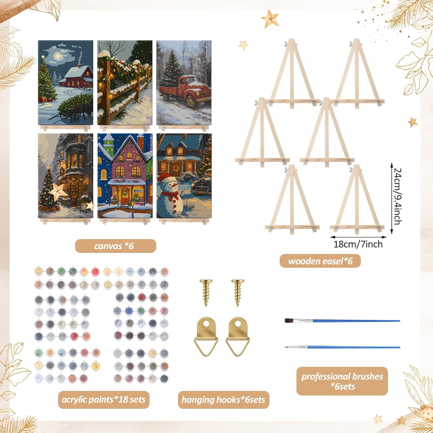 | Included Components | 6 pre-printed canvases, vibrant acrylic paints, 3 nylon brushes, 6 wooden easels, hooks, and a guide |