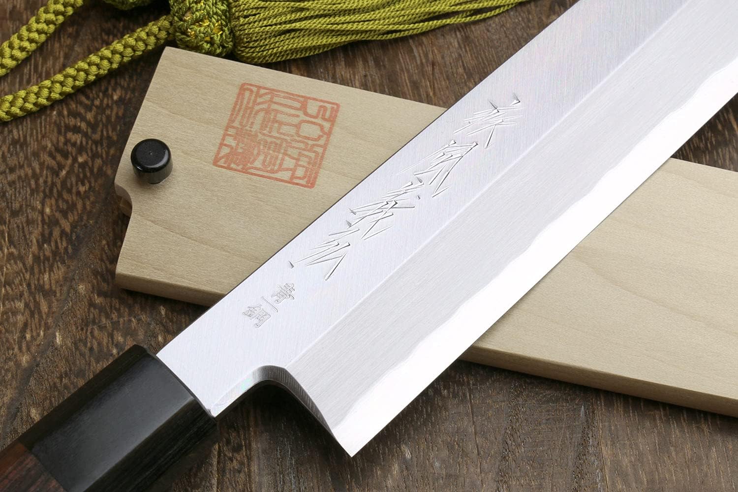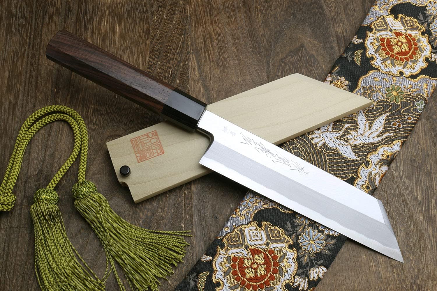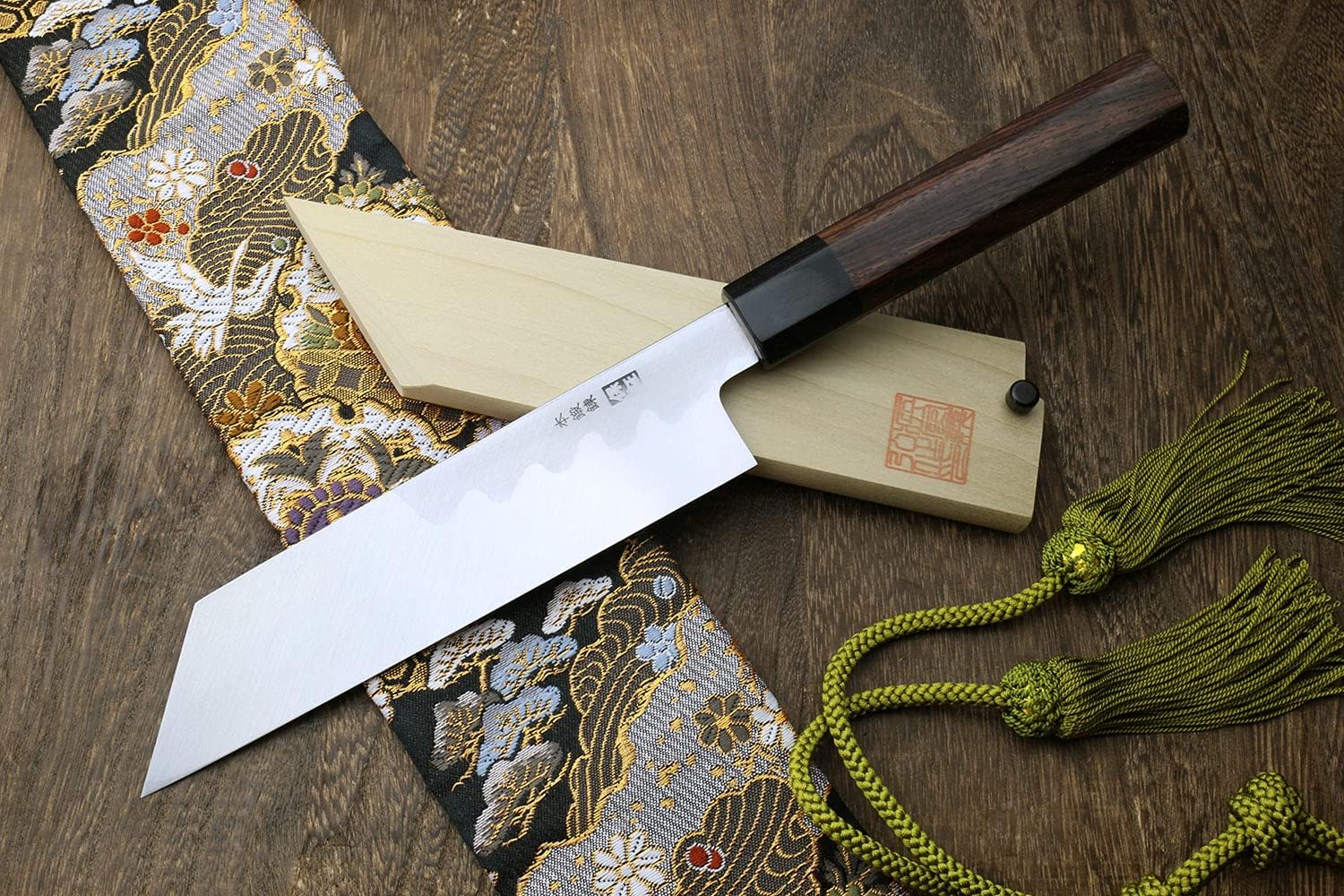 Knife Features→KNIFE CAN BE OXIDIZED WITHOUT PROPER CARE *RECOMMEND FOR PROFESSIONAL ONLY*→ Blade Material: Blue Steel #1→Edge Angle: Single Edged→Grade: Ao-Namiuchi→Handle Shape: Octagonal / Handle Material: Magnolia→HRC:64→Knife Style: Kenmuki Utility Vegetable Knife→Stain Resistant: No→Saya Cover: Magnolia Saya CoverOur Handmade Yoshihiro Aonamiuchi Blue Steel knives are crafted with extraordinary skill by our master artisans. Aoko Blue Steel #1 with a hardness on the Rockwell scale of 64, is intricately forged with iron to create beautiful wave like patterns. It takes a very high degree of skill to create knives of exceptional performance with such exquisite beauty. Namiuchi means wave forged, and our master artisans blend aesthetics with the highest quality materials and craftsmanship.Kenmuki knife is a traditional Japanese knife that is used for smaller precision tasks and can intricately carve and style vegetables and fruits for beautiful presentations and garnished. Even the simplest of tasks are elevated with a handcrafted knife that is as beautiful as it is functional.Proudly made in Japan and not mass produced. This knife is complimented with a traditional Japanese Wa-style handcrafted Octagonal Handle that is lightweight and ergonomically welds to the hand for seamless use. A protective wooden sheath called a Saya is included, which protects the knife and adds to its appearance when not in use. Every knife from Yoshihiro is handcrafted by master artisans creating a unique one-of-a-kind work of art.Traditional Japanese knife making values a sharp edge, which requires attention and care. Sharpening and honing should be done with only water whetstones. Hand wash and dry only, and do so immediately if working with acidic ingredients. Do not use on objects such as bones, nutshells, and frozen foods.