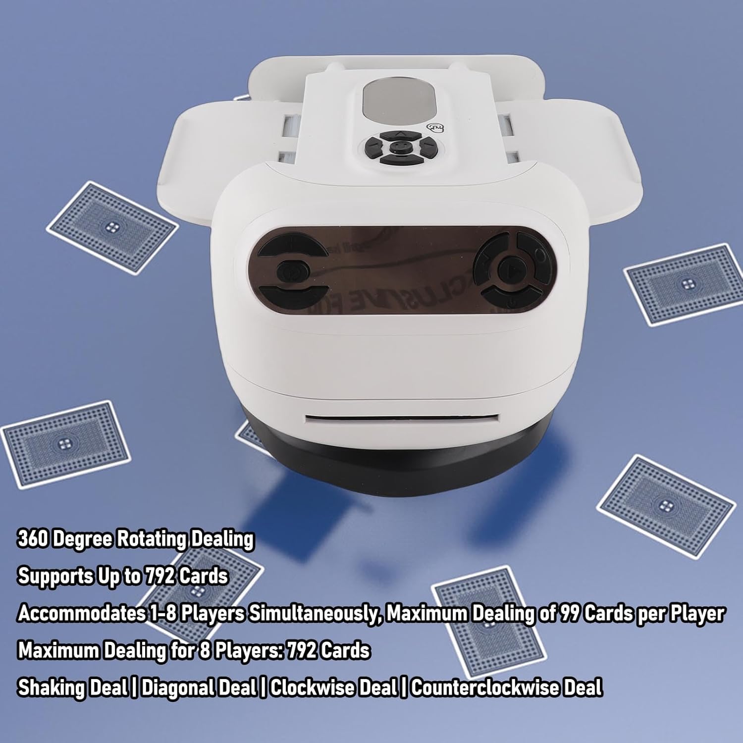Specification: Item Type: Automatic Card Shuffler Dealer Material: ABS Battery Type: Lithium Ion Battery (Built in) Battery Capacity: 2600mAh Product Size: Approx. 172x142x115mm / 6.8x5.6x4.5in Maximum Card Width Support: 65mm / 2.6in How to Use: Just follow the operating in the manual. packing list: 1 x Automatic Card Shuffler Dealer 1 x Charging Cable 1 x Instruction Manual