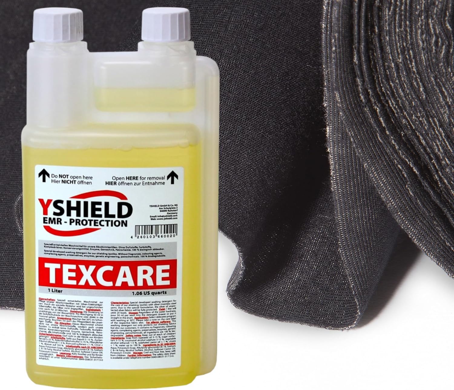 Yshield's EMR-Shielding TEXCARE is a specialized liquid detergent designed for the care of shielding textiles with silver and steel threads. This 1-liter bottle yields 20 loads, ensuring long-lasting cleaning power. Free from fragrances, coloring agents, complexing agents, preservatives, enzymes, and petrochemicals, all ingredients are 100% biodegradable. The unique formula, developed by Yshield, preserves the shielding properties of your garments while gently cleansing them. With a blend of soap from rapeseed oil, sugar surfactant, coconut oil alcohol sulfate, vegetable alcohol (ethanol), sulfated castor oil, and citrate, this detergent offers effective cleaning without compromising fabric integrity. Ideal for maintaining the performance of your shielding apparel, TEXCARE ensures your garments remain in top condition.