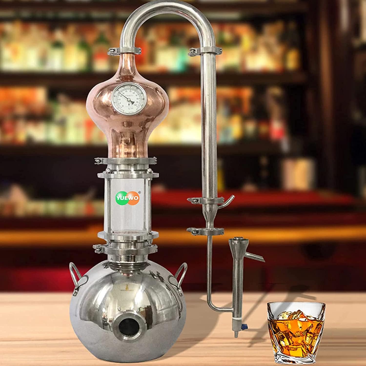 Thanks for Shopping in our Amazon Store, we are a professional business company, we YUEWO have engaged in online business for about 8 years, we always providing the best products and the best service ! Specification: Material: copper food safety grade copper 304 stainless steel heat resistant glass Ejection speed: 2 - 2.4 L / h Warm-up time: 20 - 40 minutes Concentration adjustment: reduce heating power to increase concentration The temperature of the liquid is 20 - 30 °C. It is cool to touch the liquid pipe by hand. Volume: 15 liters (15 kg) Product size: 45*35*75CM Weight: about 12KG Heating Method: real fire, induction cooker Application: Suitable for all the world's fruit wine brandy, white sugar fermented rum, juniper gin, height of pure vodka, single malt whisky. In addition, our products are used to distill glutinous rice to ferment Chinese white wine, and low temperature vacuum extracts pure dew. Tips: 1) After distillation, each component is removed in sequence. 2) Wash the surface of the part with water, especially the part of copper. 3) Dry the parts with a towel or a blower, especially the copper part. 4) The copper distillation effect is good, but it is easy to oxidize and discolor. Uniform oxidation has little effect on the appearance, but direct contact with the skin or residual moisture can cause the area to form a deep colored spot. For aesthetic reasons, please try to avoid direct skin contact.