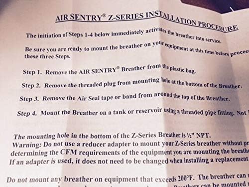 Air Sentry Z-134 Desiccant Breather, 1/2" FNPT Mounting Connection. Designed for applications where space is limited or air flow requirements are below 5 cfm. The Z-Series is typically used on gearboxes and low fluid volume applications where mounting space is limited or where a larger breather won't fit without remote mounting.