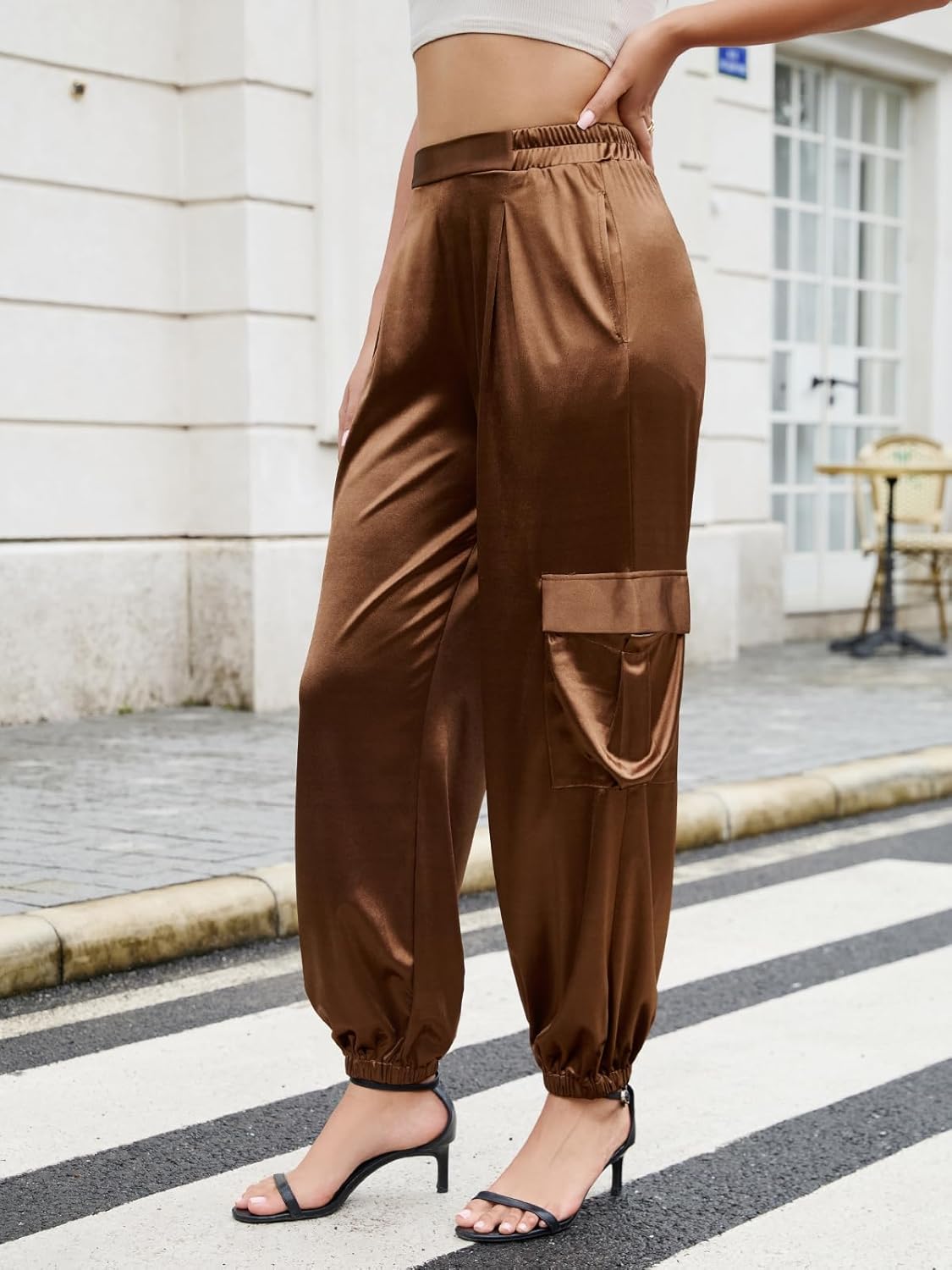ZAFUL Womens Satin Joggers 2025 Boho Chic Cargo Jogger Pants High Waisted Stretch Silk Ankle Pants Slack Trousers