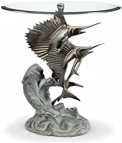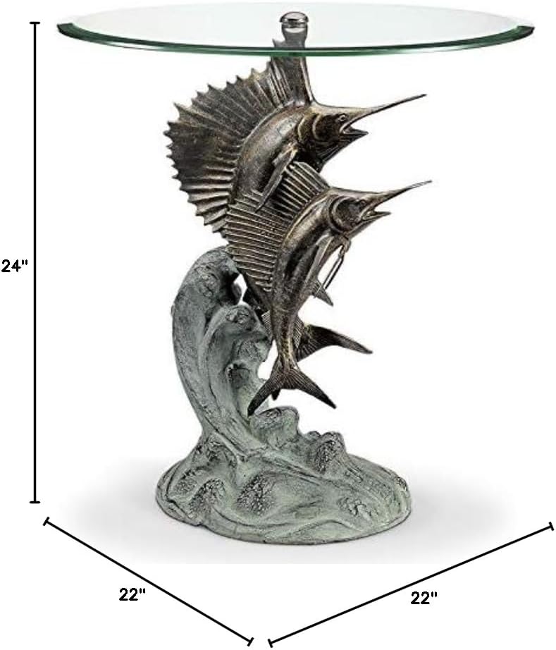 Elevate your decor with this exquisite glass top accent table, graced with a striking marlin and sailfish base that adds a touch of marine elegance to your space. The table's artistic design is brought to life as a round clear plate glass top is gracefully supported by the top of the marlin's fin. Finished with a lovely metallic bronze and verdigris finish, this table radiates an air of timeless charm and sophistication. Standing at a height of 24 inches and with a diameter of 22 inches, it becomes a captivating and versatile accent piece for your living space. Whether placed as an artistic centerpiece or a functional side table, this glass top accent table seamlessly combines form and function. It invites the spirit of the ocean into your surroundings, creating an ambiance of maritime beauty and admiration in your home. Embrace the allure of the sea with this stunning piece.