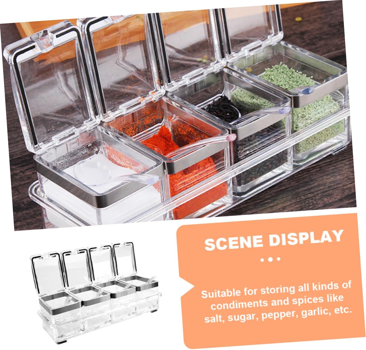 Package Include 4 x Seasoning Boxes 4 x Spoons 1 x Organizing Tray Features -Material: Acrylic, stainless steel condiment containers with lid - Size: 25.00X9.50X6.20cm/9.82X3.73X2.44in sugar jars -Color: Transparent spice containers - Enough for you to store different spices and separate design can them tainted by each other's salt jar. - elevate any home decor. Adding style and elegance to your kitchen and dining table spice box. - Can be used for sugar, salt, spices, pepper, seasoning, liquid sauce, powder, etc, make your cooking more easy seasoning jars. - It has a simple design, but very practical in use, giving you a sugar container. - Clear transparent container allow you to view the contents clearly. Conveniently to recognize the spice needed seasoning containers.Goods Descriptionseasoning containers You can store use them to store salt, pepper, chili, sugar and other condiment you have, and the lid is helpful in preservation, it will help to keep your kitchen in tidy.condiment containers with lid This condiment containers feature a stylish and chic look, which can match well with your kitchen decor and highlight your taste