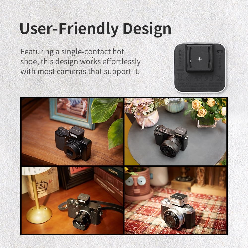 | Compatible Mountings | For Fuji,For Canon, For Nikon, For Sony, For Leica Cameras ., 𝗡𝗼𝘁 𝗖𝗼𝗺𝗽𝗮𝘁𝗶𝗯𝗹𝗲 with 𝗦𝗼𝗻𝘆 𝗭𝗩-𝟭𝗙 (cameras without a single-contact hotshoe),Verify your camera's hot shoe type before ordering |