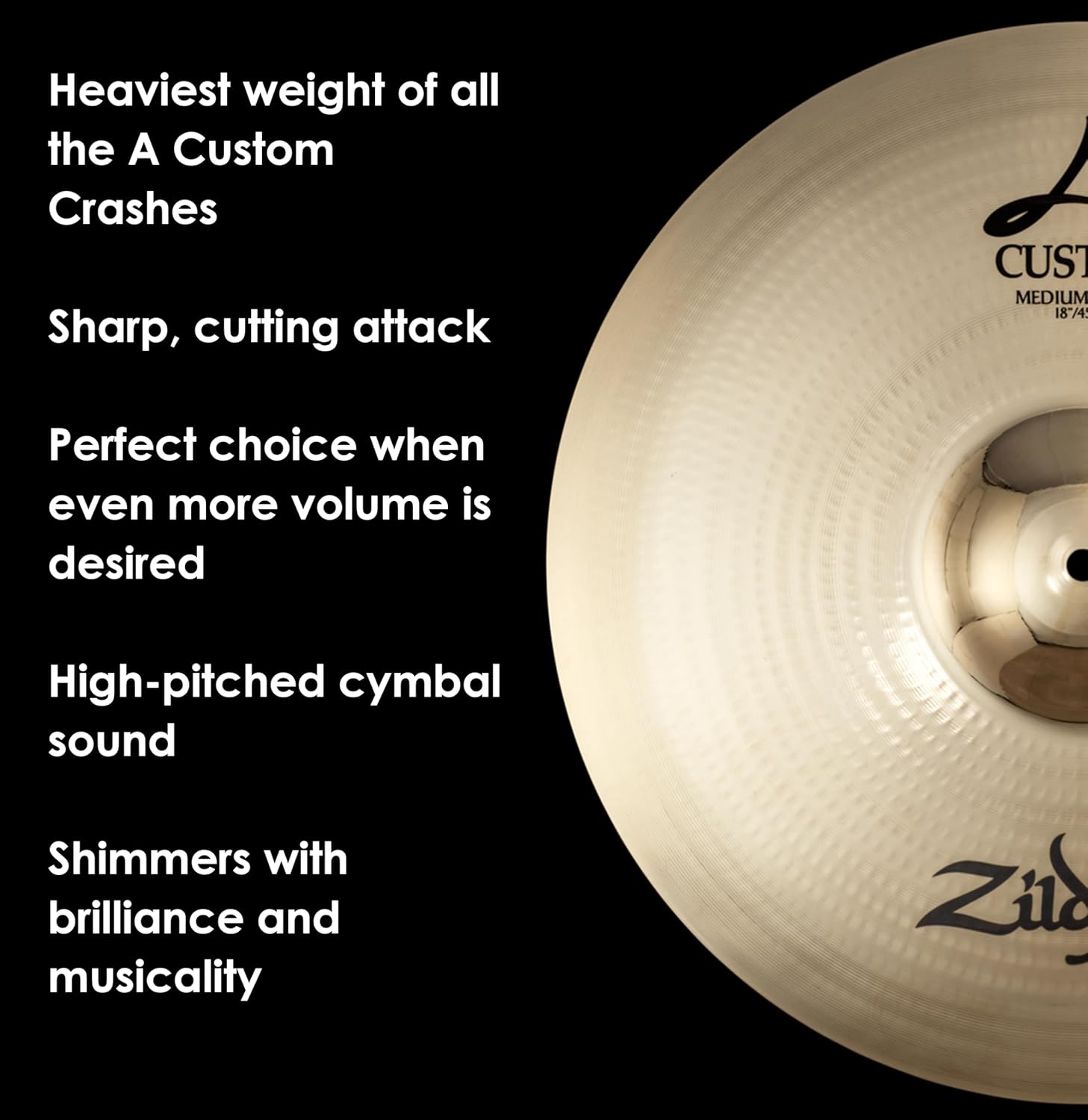 The heaviest weight of all the A Custom Crashes, the Medium Crashes have a sharp, cutting attack with a high pitched cymbal sound, yet shimmer with brilliance and musicality.