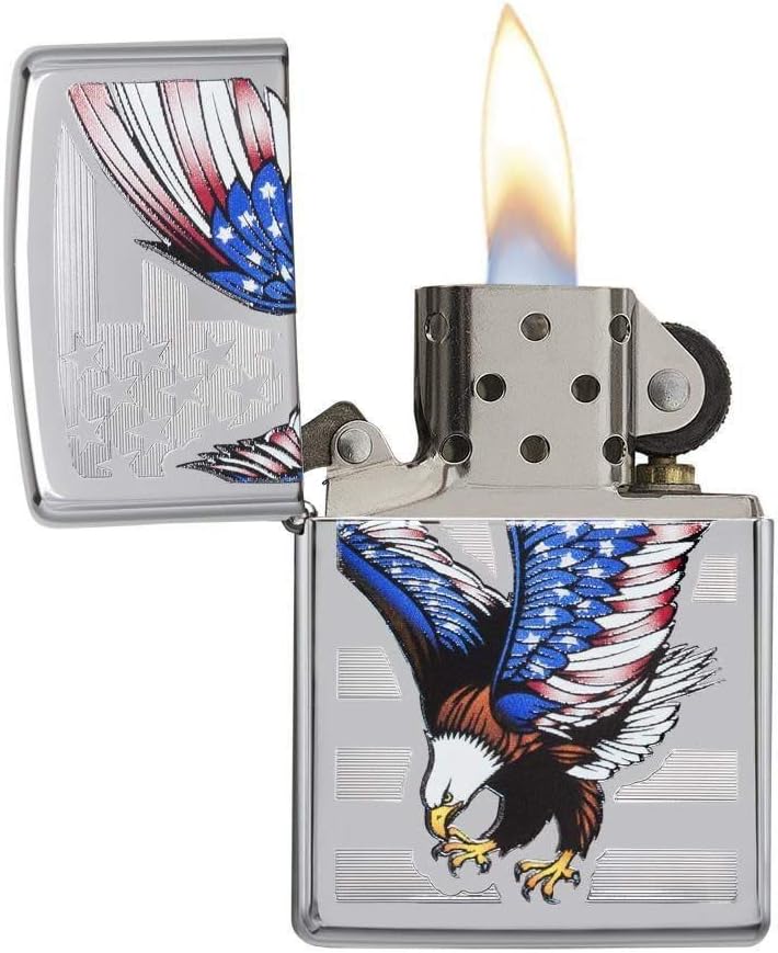 Our eagle lighter collection were created as an American symbol that display the icon of our nation. The eagle collection includes various imprint methods such as color imaging, engraving, deep carve and emblem attachments. Base model finishes include; Black Ice, High Polish Blue, Brushed Brass, Brushed Chrome, High Polish Chrome, Street Chrome and White Matte. Each lighter has a bottom stamp signifying the year it was made, is refillable, and is backed by Zippo's lifetime guarantee. All windproof lighters are American made in our Bradford, PA factory and come packaged in a gift box.