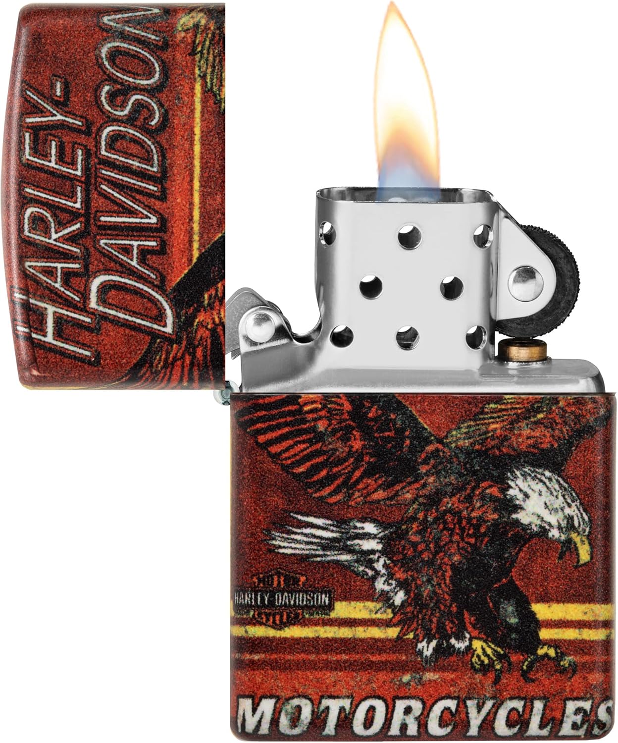 Zippo Lighters go hand in hand with the Harley-Davidson brand. Show your true spirit for both brands by shopping the Harley-Davidson Collection. Harley-Davidson eagle wings lighters are created using Zippo's imprint methods; color image, emblem attachments, deep carve and engraving. These unique designs have been placed on several differed lighter cases; Antique Brass, Cream Matte, White Matte, Black Matte, High Polish Chrome, Street Chrome and Brushed Chrome. Each lighter has a bottom stamp signifying the year it was made, is refillable, and is backed by Zippo's famous lifetime guarantee. All windproof lighters are American made in our Bradford, PA factory and come packaged in a gift box.