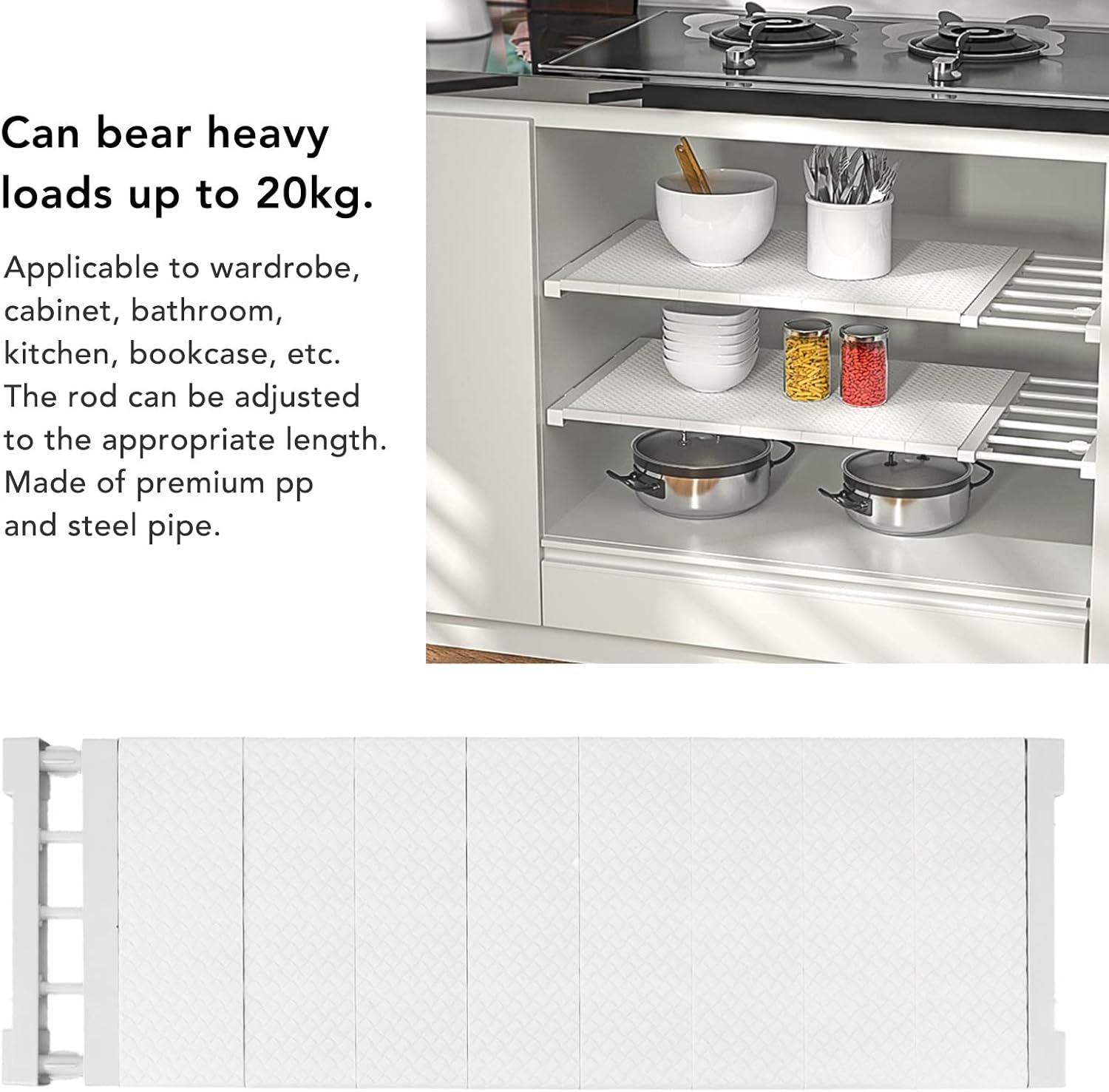 Specification: Item Type: Tension Shelf Product Material: PP, steel tube. Color: White How to Use: 1. Before installation, slightly adjust the fine adjustment counterclockwise to the initial position. 2. Install the sliding foot pad to both sides of the partition. 3. Remove the square gasket on the screw and insert it into the fixing screw hole. 4. Stretch the shelf to the required length, and try to stick to both sides of the support after stretching. 5. After stretching the length, fix it with T shaped screw to make the length of small tube not shrink. 6. Put the shelf flat and tighten the fine adjustment on both sides alternately clockwise until the tripod is firmly supported. Package List: 1 xTension Shelf 7 x Accessory or 1 x Tension Shelf 6 x Accessory