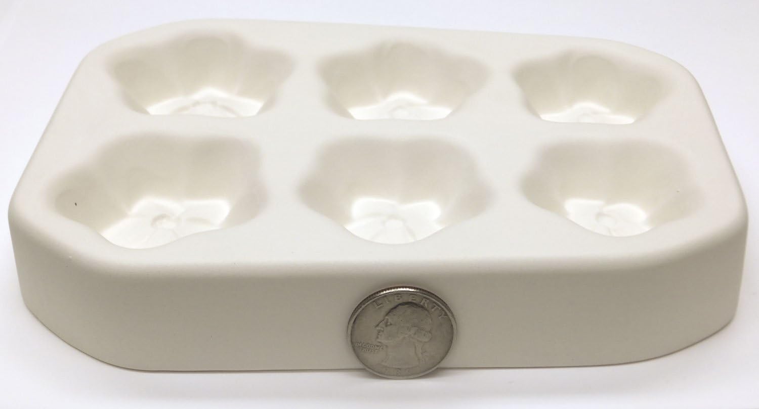 Colour de Verre Molds are the Simple Way to Cast Glass Merge the age-old art of pate de verre glass casting with modern technology and contemporary design! Create pieces that are beautiful enough to stand alone or to incorporate into larger projects. The open, hollow design promotes even heating and cooling. Molds can be filled with glass frit, powder, or sheet glass. Reusable mold casts 6 blossoms from 1" to 1-1/2" in one firing, for the ultimate in convenience. Overall mold dimensions 5" x 7" x 1-1/2". Suggested fill weight 6 grams, 8 grams and 10 grams. See size perspective of mold with quarter and dime images shown. This mold works best when glass is cast thin. Click on "View User Manual" to download a free, helpful technique sheet. Green and purple blossom images courtesy of Colour de Verre. Blossom ring created with stretch ring (#70493) by artist Kayleigh Clark.