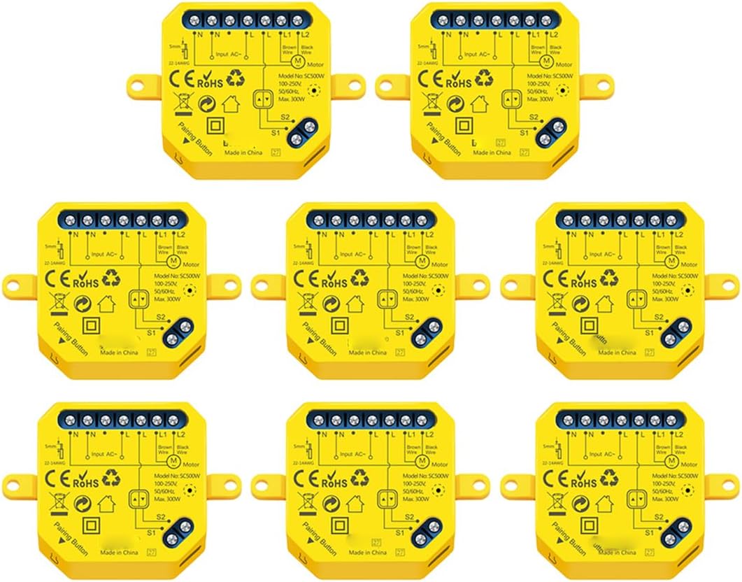 Switch Type:Switch ModuleWifi Smart Curtain Switch:DIY Smart HomeWorks For:Smart Blinds, Smart Curtain, Roller Blinds, ShutterCompatible With:Tubular Motor With 4 WiresWorks With:Blinds Shutter With Electric MotorSwitch Type:Toggle Switch, Rocker Switch, Back And Forth SwitchDimensions:48Mm*47Mm*22Mm:App ScheduleRemote Control:App Remote ControlPlastic Material:Fireproof ABSFactory Quality:ISO9001:2015 FactoryCertification:CE, RED, EMC, RohsNote before order This is a Wi-Fi only Curtain Switch Module, it can’t work with our RF curtain remote. Please don’t buy the extra RF remote to add the remote control, they are not compatible. Input Voltage: 100~250VAC, 50/60Hz;Output Voltage(Motor Voltage): 100~250VAC, 50/60Hz(Our switch can't work with DC motor!) Please check your motor is with 4 wires (Blue Wire, Brown wire, Black Wire, Green/Yellow Wire) before you buy our curtain switch module. And please be noted that neutral wire is a must for the installation, or you can't use our device. Our curtain switch module is compatible with toggle switch(rocker switch, back and forth switch, 3 stable status switch) and button switch(spring switch), but if your wall switch is button switch or spring switch, the wall switch needs to be pressed all the time to give a continuous signal to run the motor. Please don't buy our curtain switch module if you mind this operation manner change. New Function - Set Motor Working Time You can set the switch operation time 1s-120s quickly in the app according to your need. Then you can open the curtain at the duration time(1 ~ 120 seconds) as you need. 3 Ways to Control Your Roller Shutter 1. After you install this module, your wall manual switch still works, it can open , pause, or close the shutter. 2. Voice control can be achieved through smart home devices (speakers). 3. Mobile app remote control to open or close curtains.