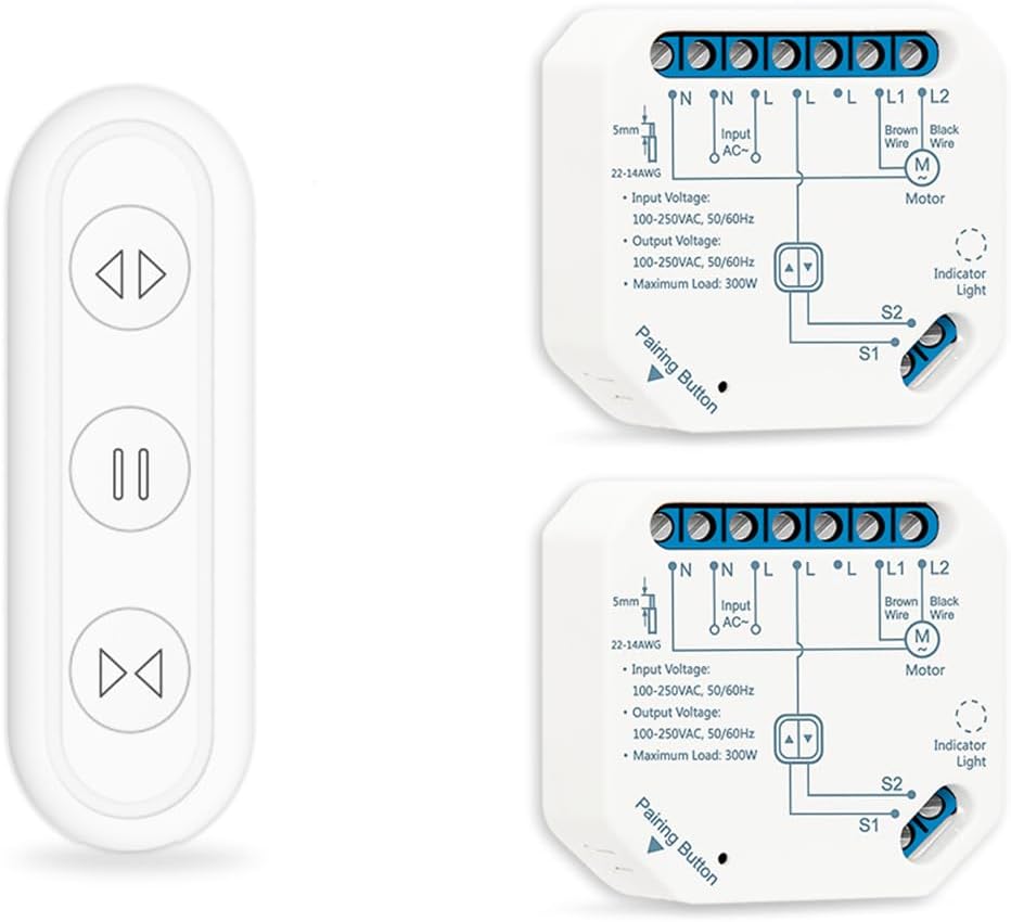 Wattage:300WVoltage:110-240VModel Number:SC517WSCOrigin:Mainland ChinaCertification:CE,RohsWarranty:2 YearsInput/Output Voltage:100-250VACCertification:CE, Rohs, FCCAPP Name:Smart Life,TuyaSupport System:Both Android And IOSRemote Control Range:Up To 30MConnect With:Electric Motor , Any BrandWorks With:Roller Shutter, Blinds, Project Screen SunscreenDIY:Smart Home, Home AutomationShutter Control:Remote ControlSmart WiFi Garage Door Opener Controller, RF+WIFI Curtain Switch with NEW function can set percentage on App Note before order: The RF curtain remote can just work with the roller shutter switch in this listing, because the curtain switch in this listing is RF + WiFi version. Please don’t buy the curtain switches in other listing even they are cheaper, they are not compatible. Please check your motor is with 4 wires (Blue Wire, Brown wire, Black Wire, Green/Yellow Wire) before you buy our. Before using App to control the shutter, please keep the wall manual switch at 'STOP' position, otherwise , the App can't work, it's to protect the motor. Please contact the seller online if you have any questions for compatibility. 1st Generation WiFi Shutter Switch Module with RF Remote Control Switch Multi ways to control the electrical curtain blinds App Remote Control ( Open, Pause, Close) Use a Manual Remote to control the curtain blinds, ( Open, Pause, Close) Control Range up to 30m Voice control can be achieved through smart home devices (speakers)., (OPEN, CLOSE, and you can make a scene in smart life App to stop the curtain) Built in RF module, enable you can remote control your blinds shutter even if you have trouble with WIFI