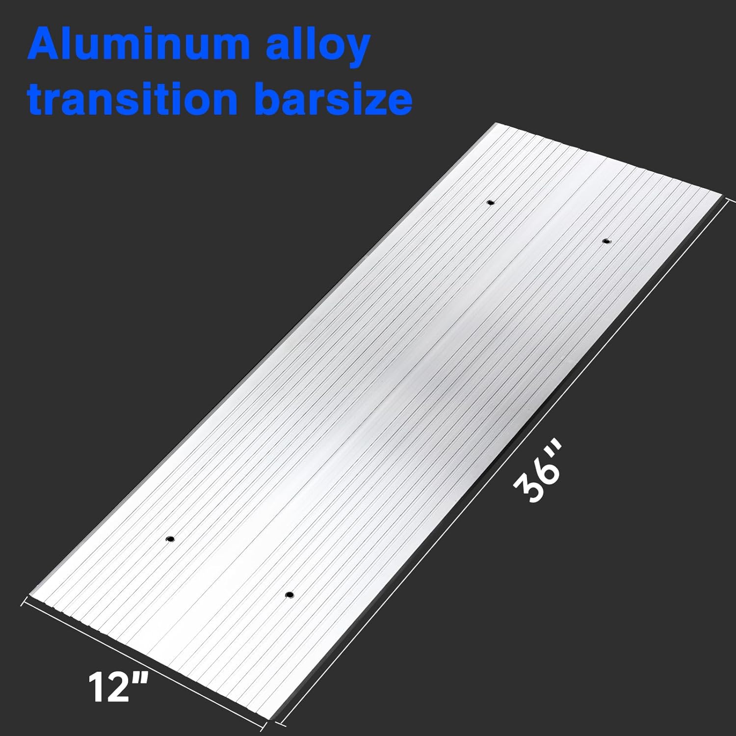 Features: Injure Protection for Floors: acting as a protective barrier, this heavy-duty aluminum commercial threshold helps shield flooring edges from wear, scuffs, and injure caused by foot traffic or moving equipment. It is especially helpful in areas between different types of floor materials. Weather and Water Resistance: the anodized aluminum construction seals gaps under doors, assisting in blocking drafts, dust, and moisture. This aluminum door threshold can contribute to better insulation and helps protect indoor areas from outdoor elements. Specifications: Material: Door threshold: aluminum Screw: nickel plating Color: silver Size: Door threshold: about 12 x 36 inch Screw: about 1.57 inch Package includes: 1 x Door threshold 4 x Screw Notes: Manual measurement, please allow slight errors on size. The color may exist a slight difference due to different screen displays Small parts included, please keep them away from little kids to avoid swallowing risk