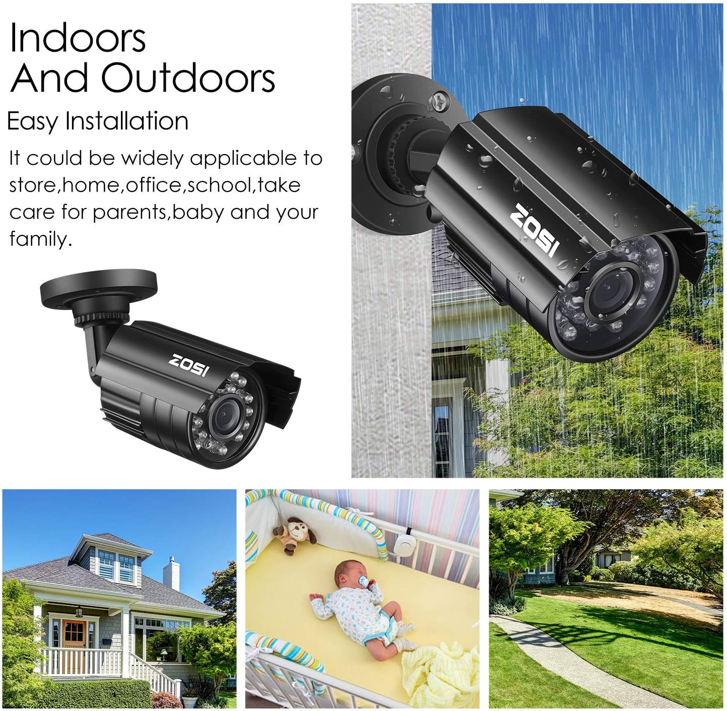 ZOSI 720P HD-TVI Security CameraThe camera is equipped with 24 infrared LEDs, which will activate when it is dark or low light to display black and white night vision capability up to 65 feet. High resolution 720P 1280TVL provide clear images, even in the dark. The camera are used more often in many indoor areas such as office,home,factories etc. Works perfectly with 720P/1080N/1080p DVR systems(not included, available separately ) Camera main Feature1280TVL 720P Resolution Bullet CameraHigh-Performance Night VisionHAD IR-CUT,More Clear/More Real IP67 Professional outdoor weatherproof Camera used high quality metal materials, can effectively prevent rust,Can be installed in almost any outdoor or indoor place.Cameras provide color video during the daytime, black and white at nightCamera Specification Image Sensor: 1/4" Aptina CMOS with ICR,720P. Horizontal Resolution: 1280TV-Lines Lens: 3.6mm IR LEDs Amount: 24pcs, 5mm LEDs IR Wavelength: 850nm IR Distance: up to 65ft (20m) Waterproof Level: IP67 Power Supply: DC12V/500mA Material: Aluminum casing Package Include: 4 x 720p TVI CCTV Camera 4 x Mounting screw bag 4 x 60ft Cable 1x 2A Power Adapter 1 x 1 to 4 Power Splitter cable 1 x Instruction manual