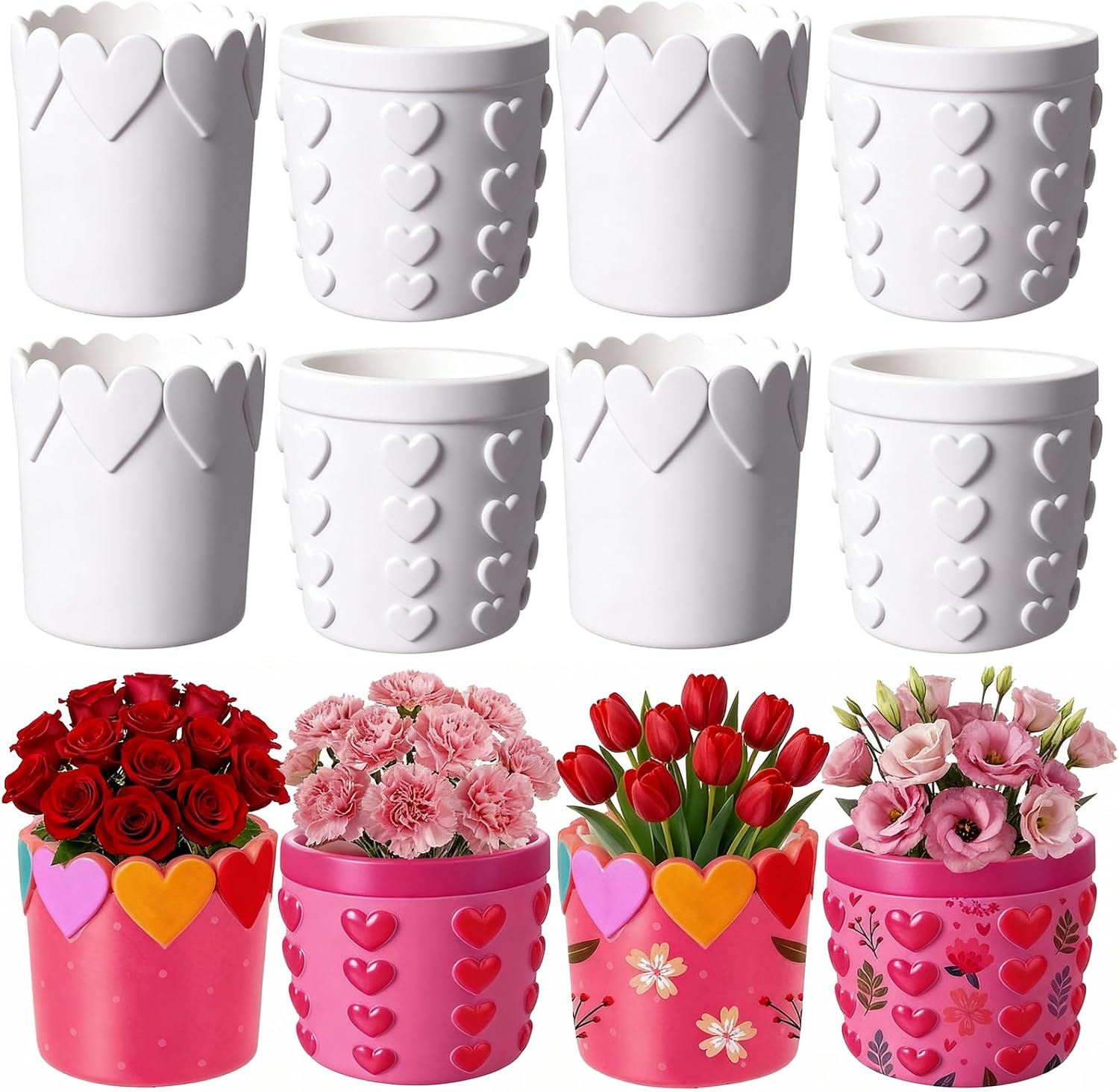 Features: Injects Fun and Life into Spaces: Once painted, these unpainted plaster can be displayed in coffee bars, tables, bookshelves, fireplaces, injecting art, fun, and life into these spaces. With their holiday themed accessories, they create a warm and festive Mother's Day atmosphere, can also double as storage boxes for pens and office supplies, keeping your workspace tidy. Heart Design: The paintable flower pots are designed in a distinctive heart shape, adding an interesting twist to your regular planters. This elegant design feature makes them a nice decorative tool, adding charm and character to most spaces. Specifications: Material: plaster Color: white Size: 3.54 in diameter, 2.95 in height Package Includes: 12 x Paint your own flower pot bulk Notes: If it is for outdoor use, it needs to be painted with waterproof paint. Manual measurement, please allow slight errors on size. The color may exist a slight difference due to different screen displays.